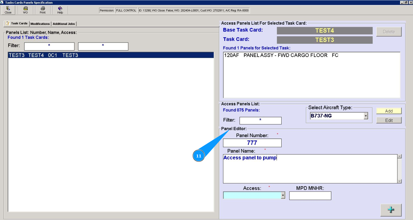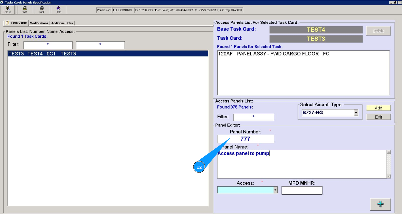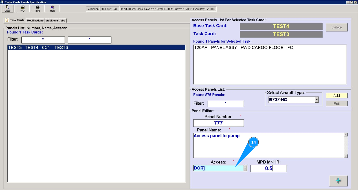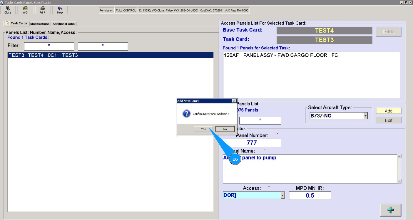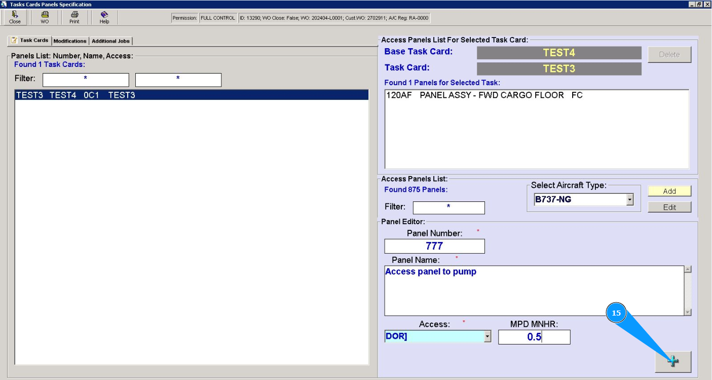 15. Click on the button with the plus symbol to add a new panel to the list of panels. Note: If necessary enter information about the required quantity of man hours to open this panel in the field: "MPD MNHR".