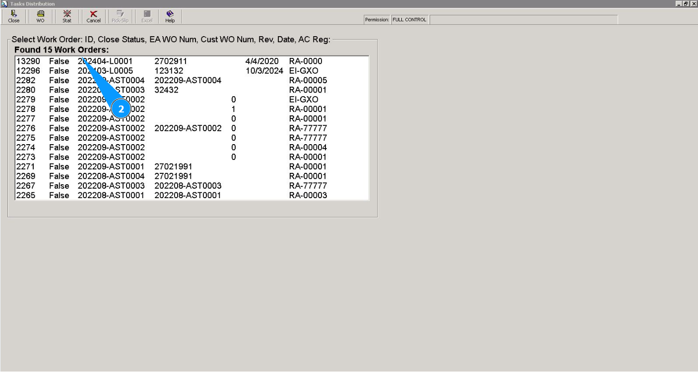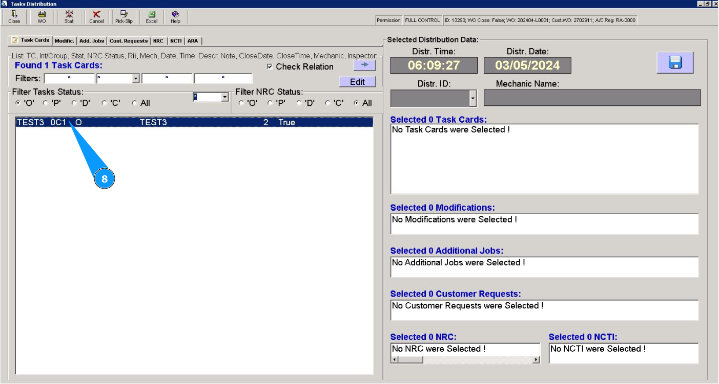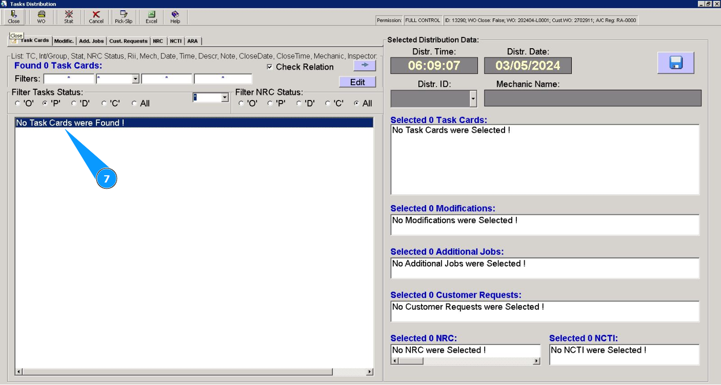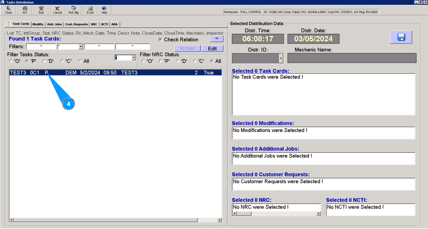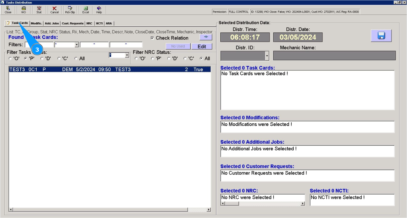 Note: This instruction describes the steps to change the status of a task created for WP. But, to change another type of work created for WP, just go to the required tab and follow the steps of this instruction. Use tabs: "Modific.", "Add.Jobs", "Customer Requests", "NRC", "NCTI".