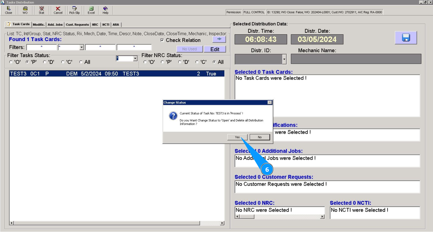 6. Click on the button "Yes", to confirm the task status change ("other"; see Note) from planned to opened.
