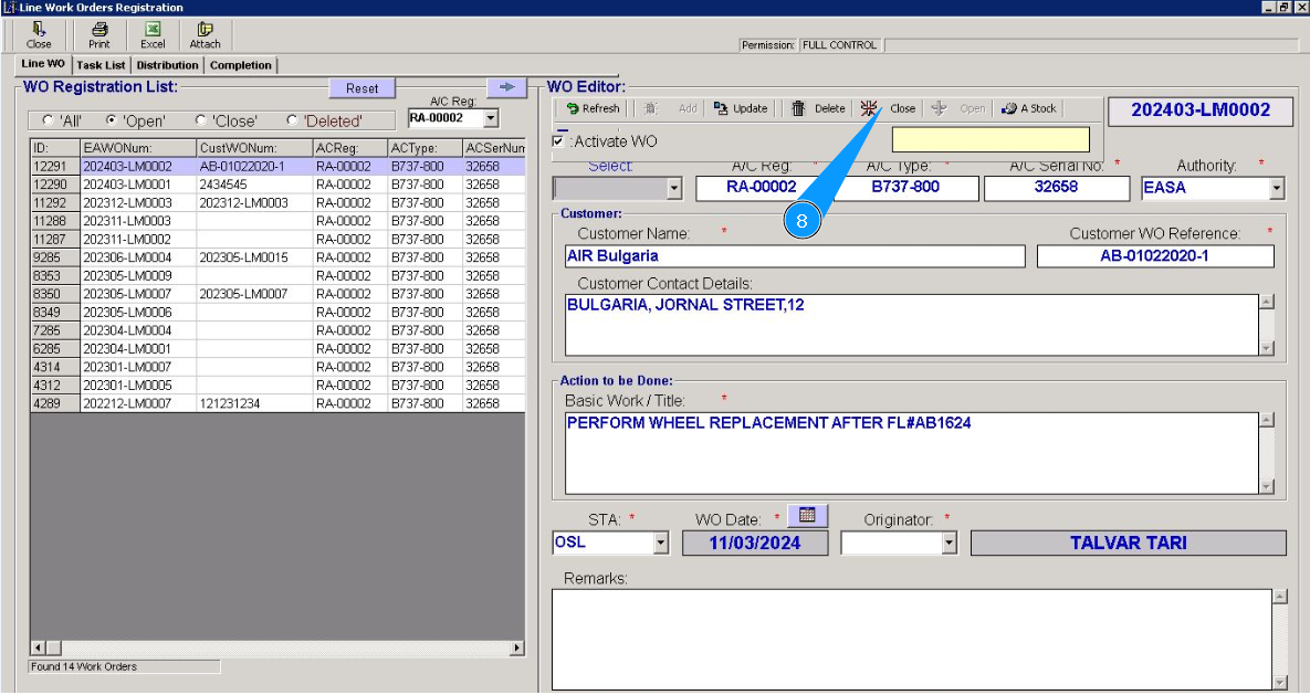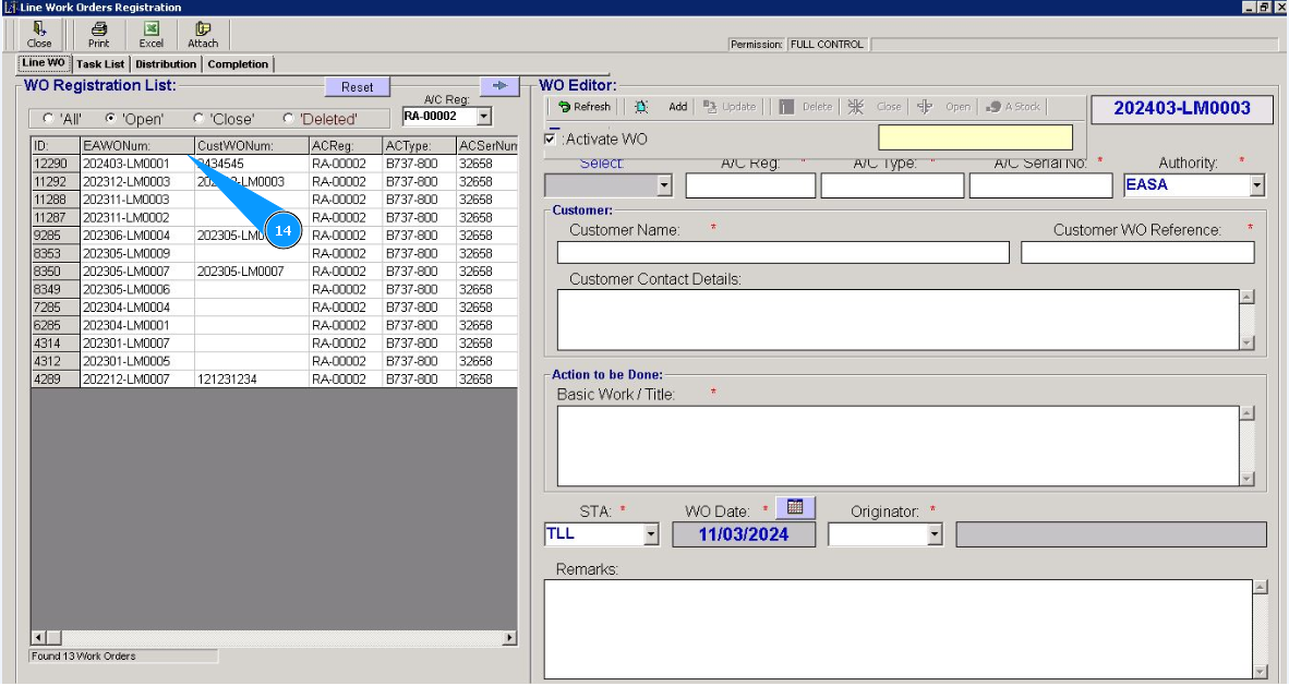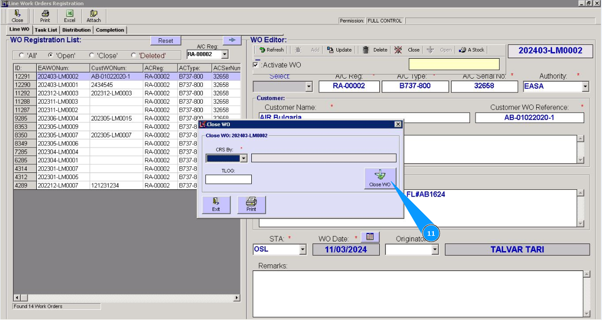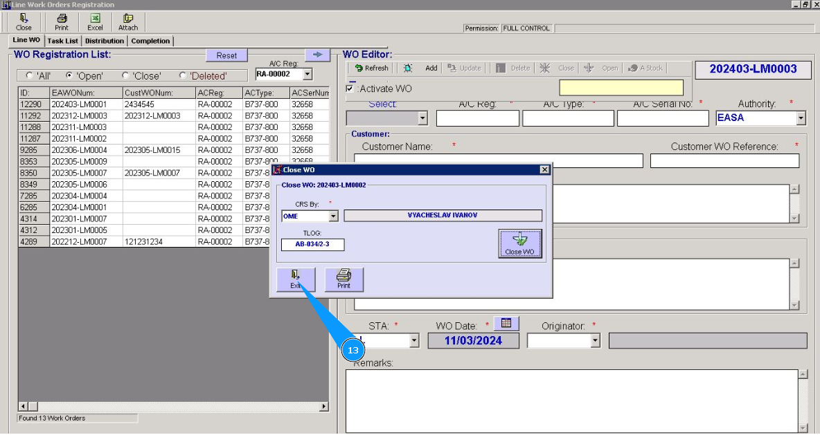 6. Select the WO number required for closing from the list in the window "WO Registration List". Click on the line with WO.