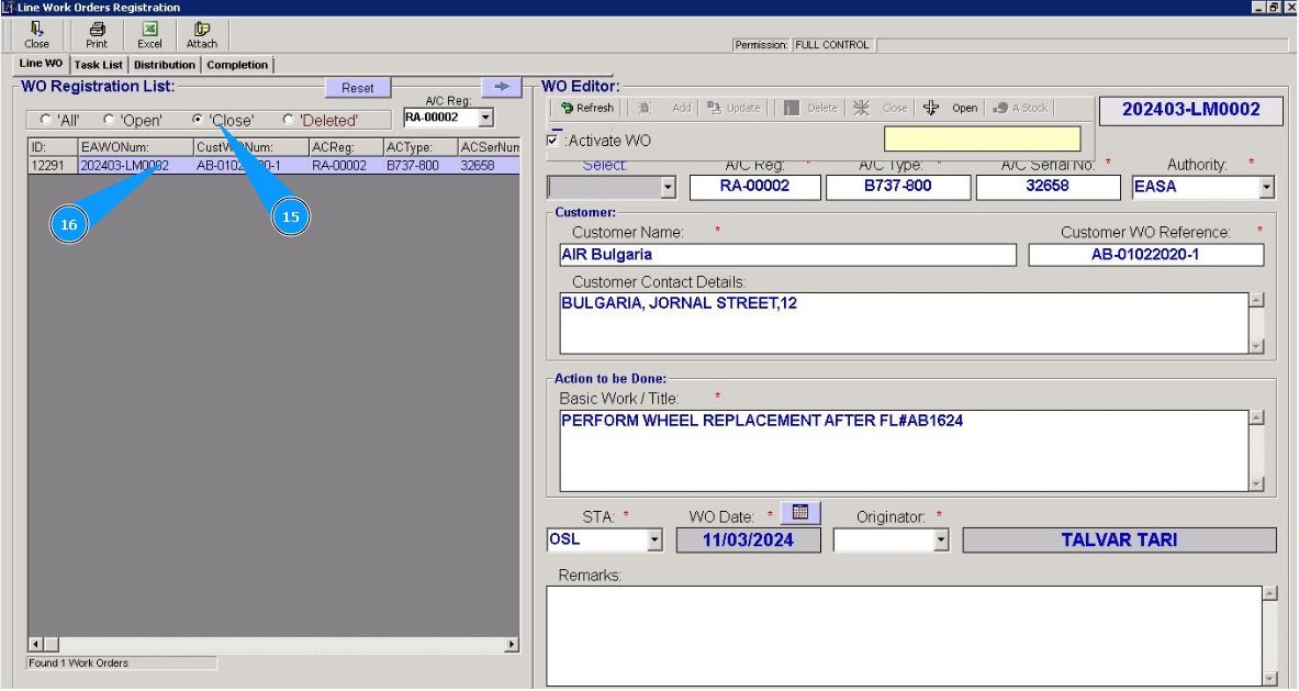 16. And make sure that the Work Order line is displayed in the closed list in the window "WO Registration List".