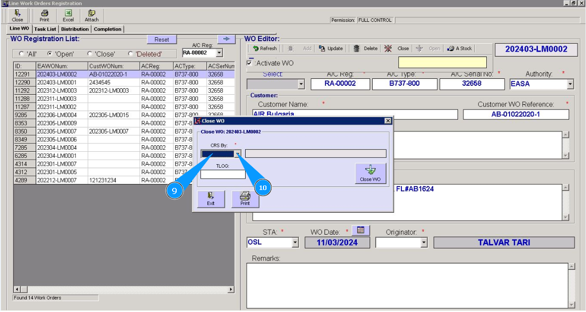 9. Enter the login of the personnel who closes the WO in the field "CRS By:" and press the knob "Enter" on your keyboard.