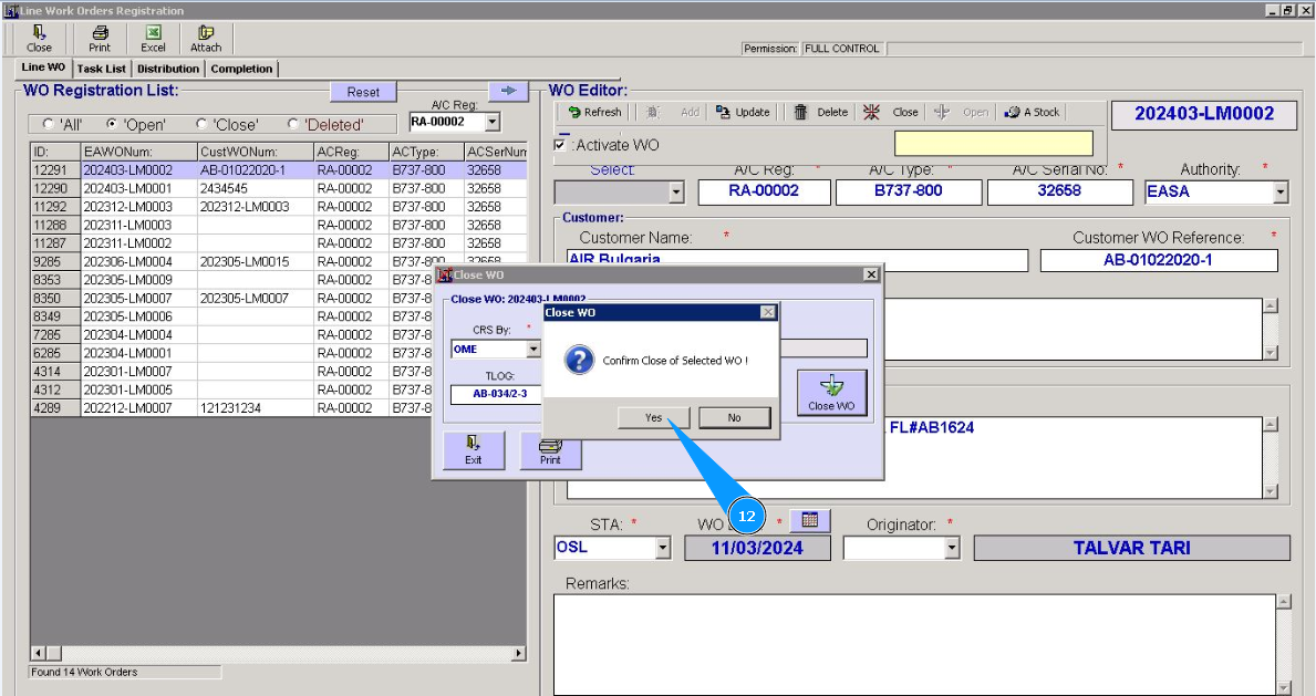 12. Click on the button "Да", to confirm that Work Order is closed.