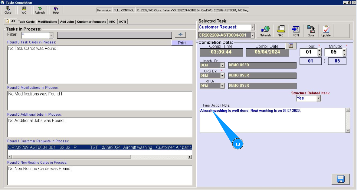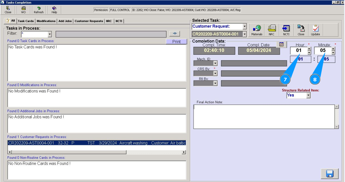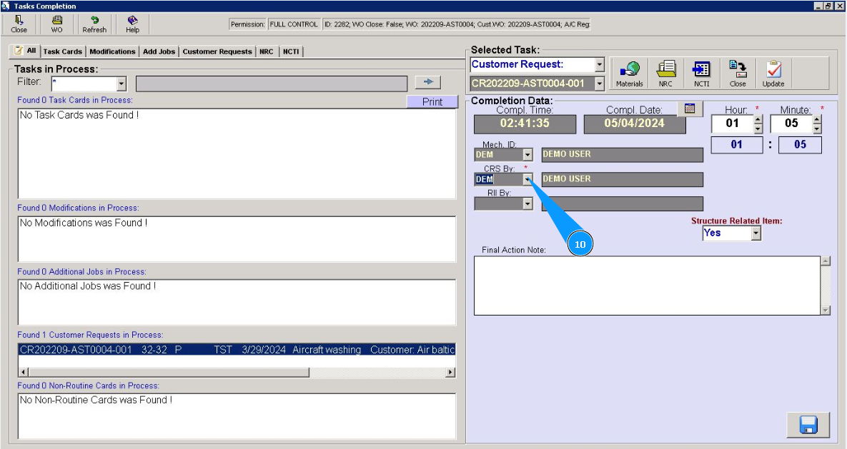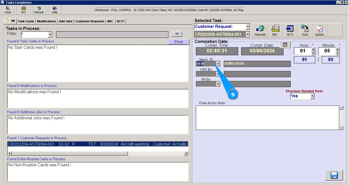 9. Select from dropdown list ID of staff who have performed this customer request in the field "Mech.ID".