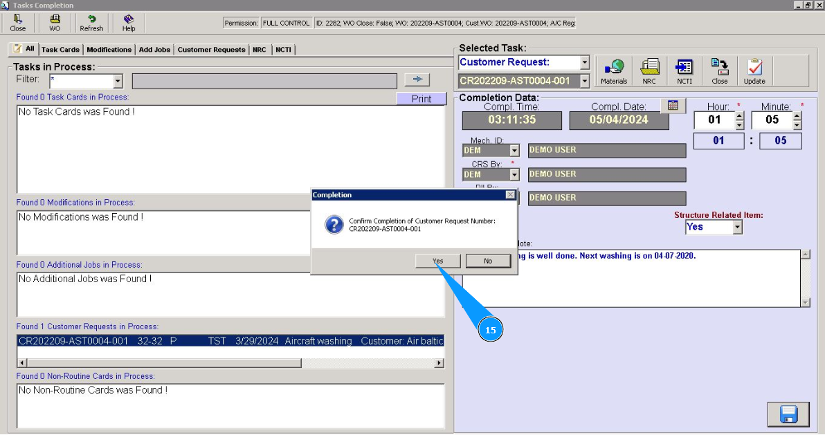 15. Click on the button "Yes", to confirm the completion of the customer request.