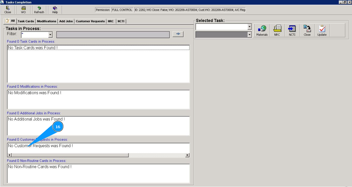 16. Check that the required customer request has disappeared from the list in the window "Tasks Cards in proccess".