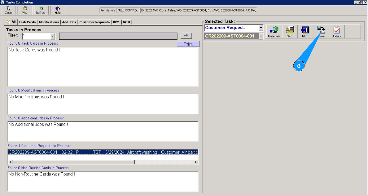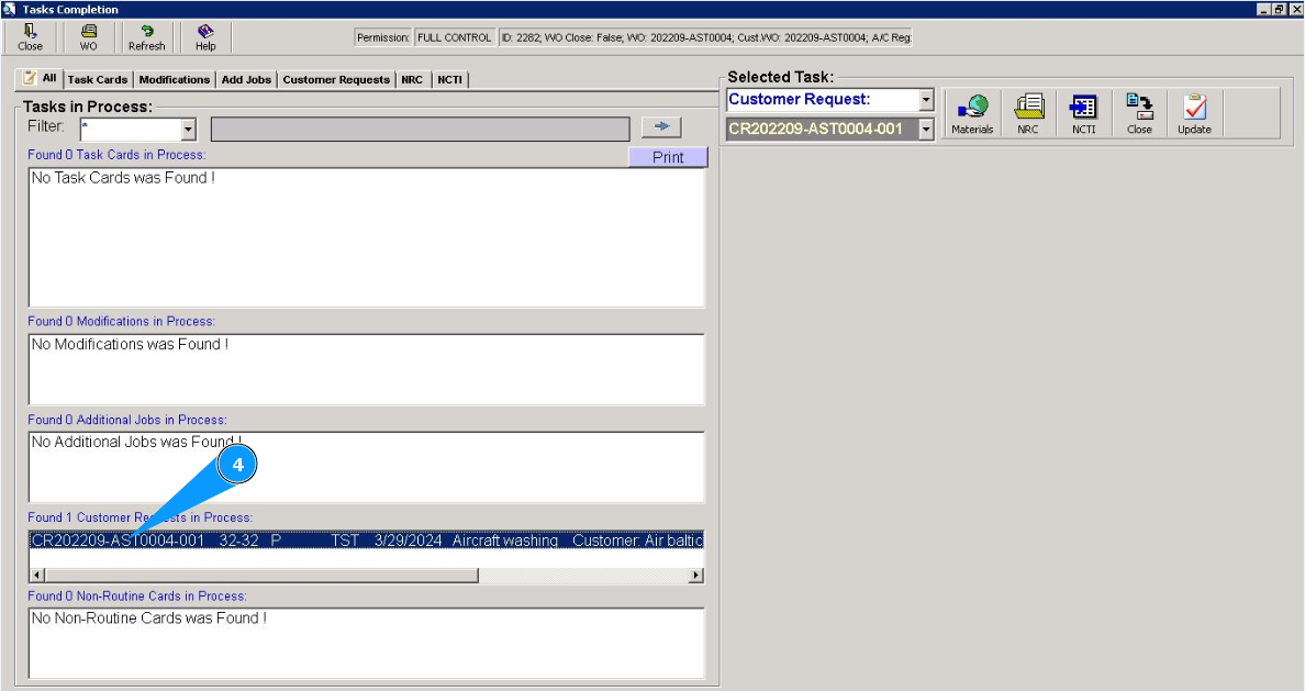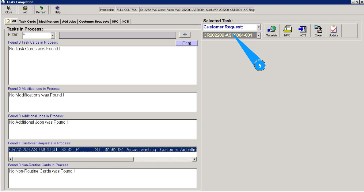 5. Check that the customer request number is displayed in the field "Selected Tasks".