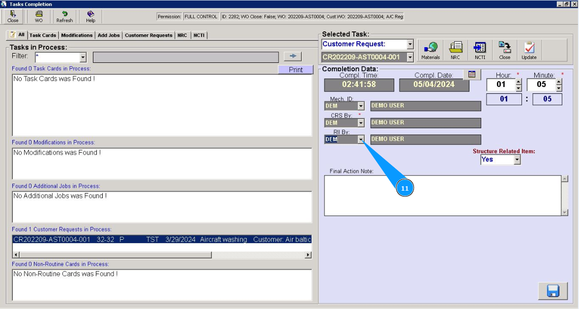 11. If necessary, select from dropdown list ID of the staff who has inspected the performed customer request in the field "RII By".