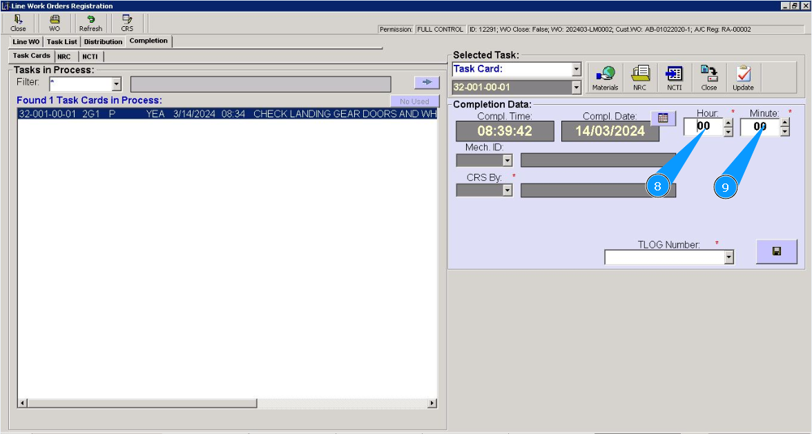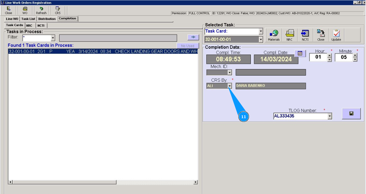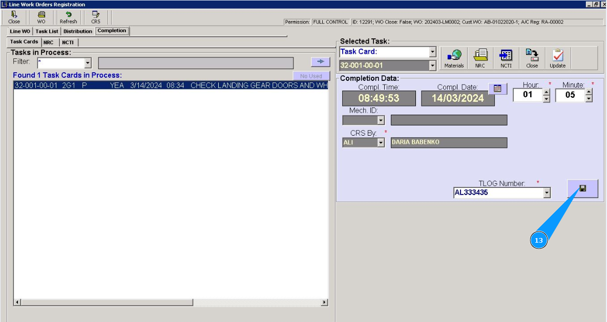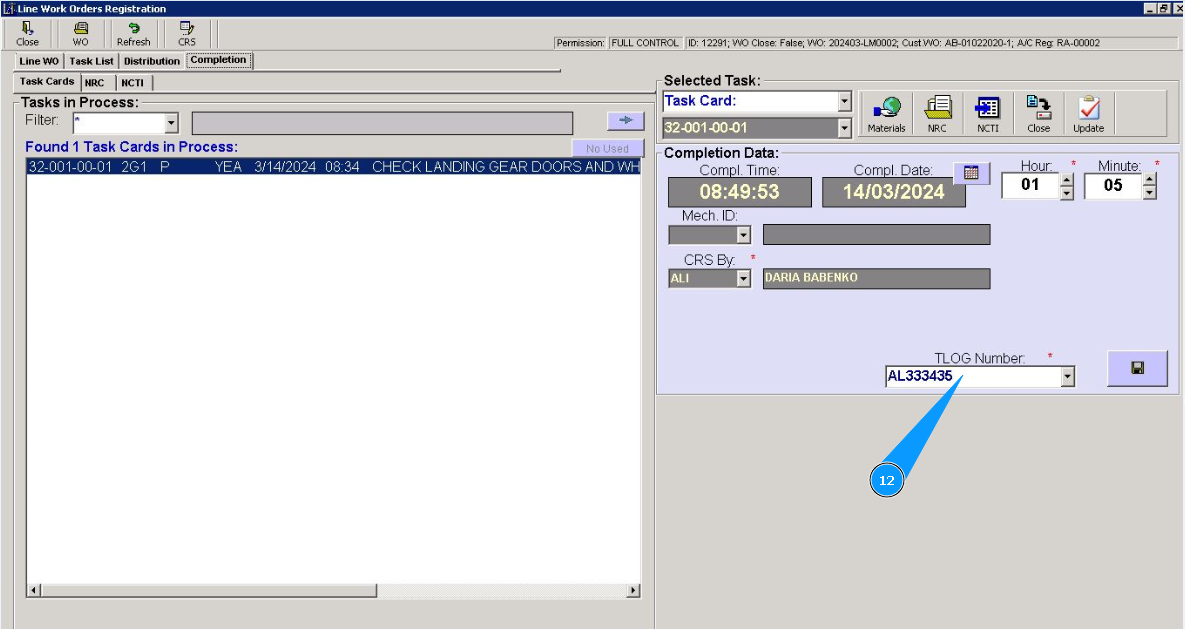 12. Enter or select from dropdown list aircraft technical logbook in the field "TLog Number".
