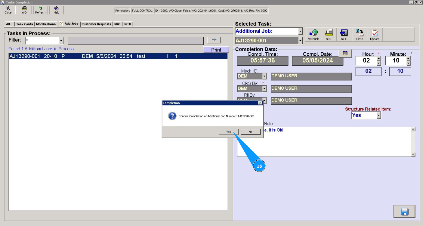 16. Click on the button "Yes", to confirm the completion of the additional job.