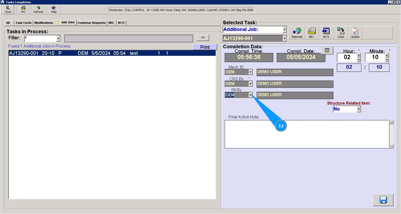 12. If necessary, select from dropdown list ID of the certifying staff who has inspected the performed additional job in the field "RII By".
