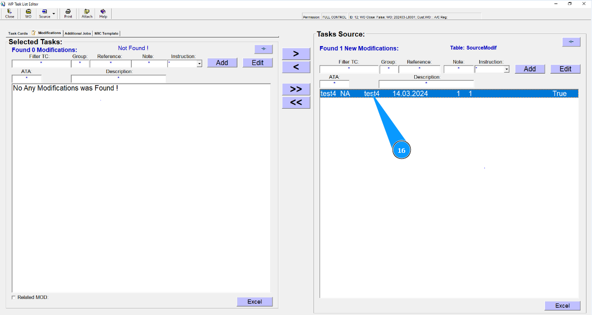 16. Check that the new task is displayed in the window "Tasks Source". Примечание: If necessary, use the available filters to quickly find your task in the list. Use the fields "Filter TC", "Group", "Reference" etc.