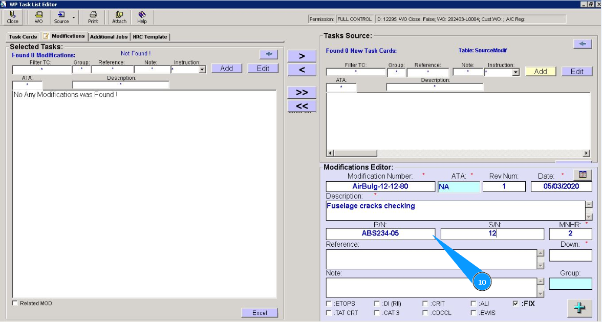 10. If necessary, enter the part and serial numbers of the component in the fields "P/N" и "S/N".