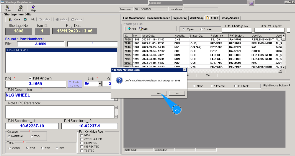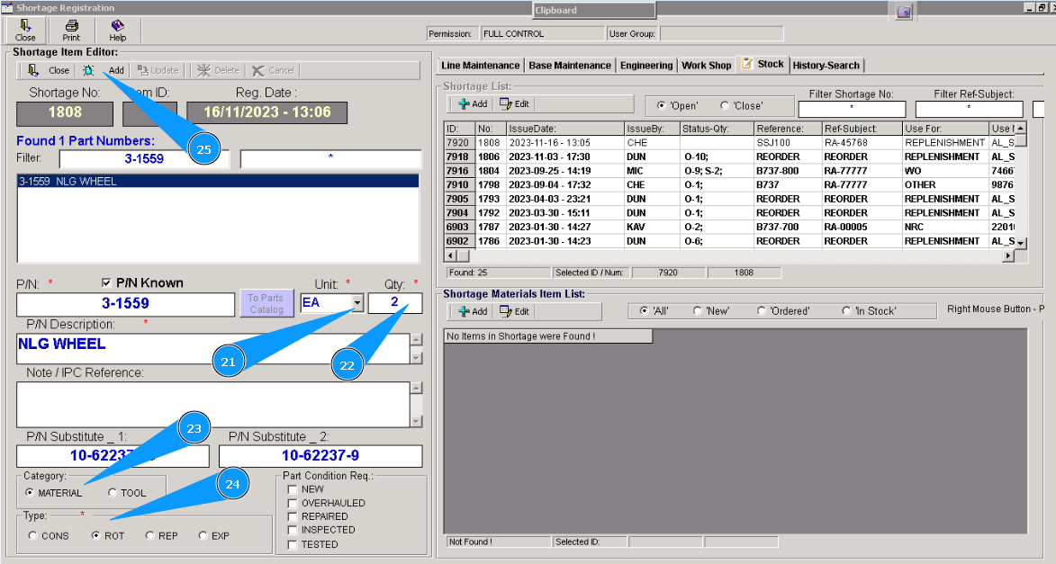 25. Click on the button "Add" in the window "Shortage Item Editor" to add selected material or tools to POR.