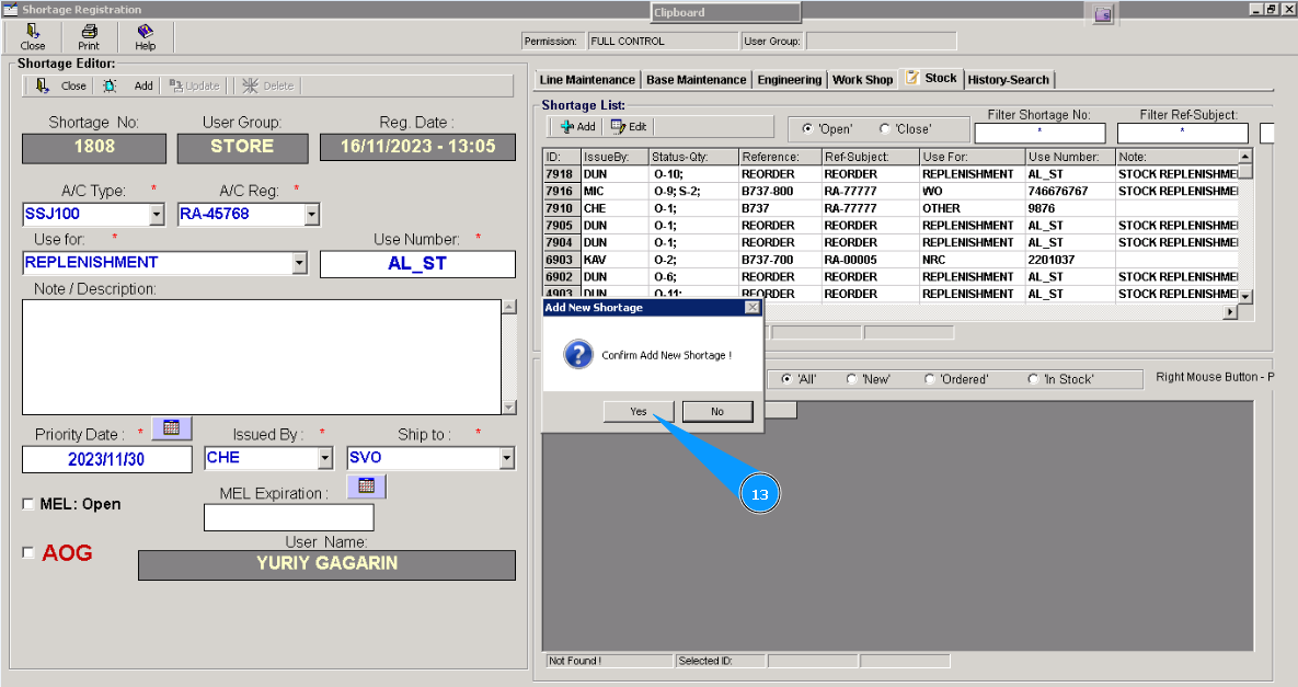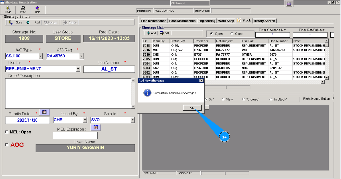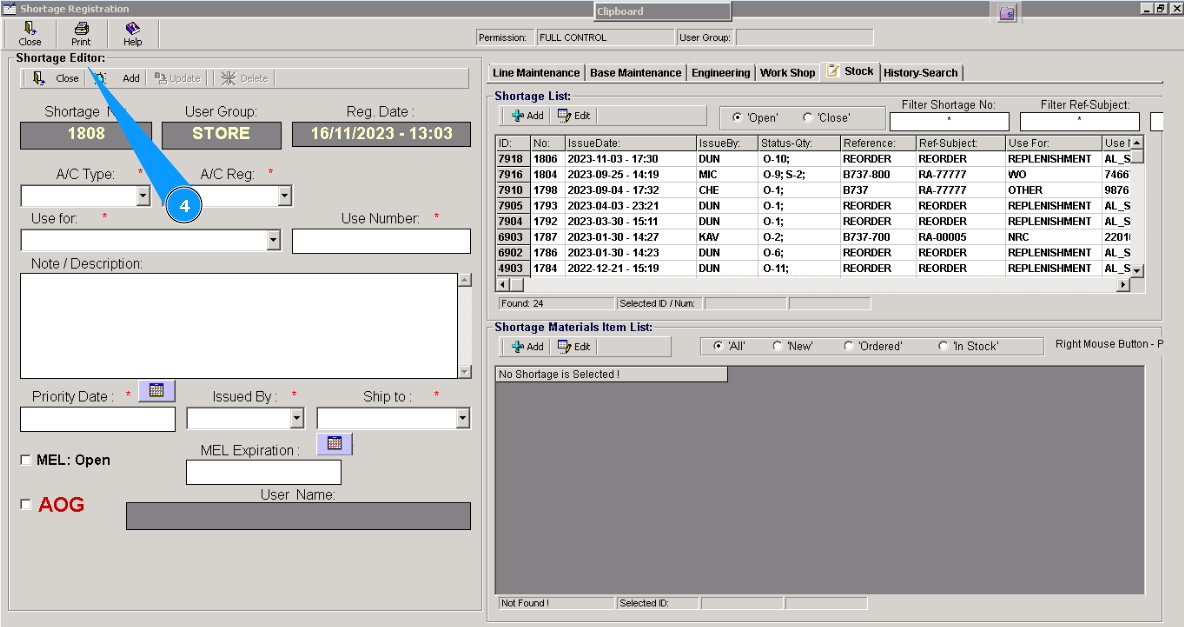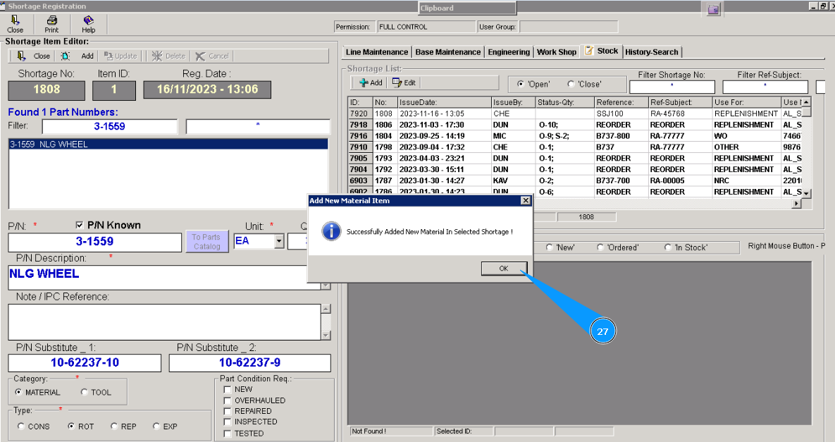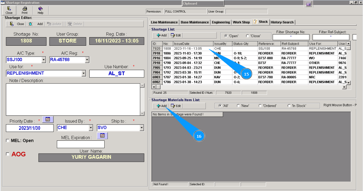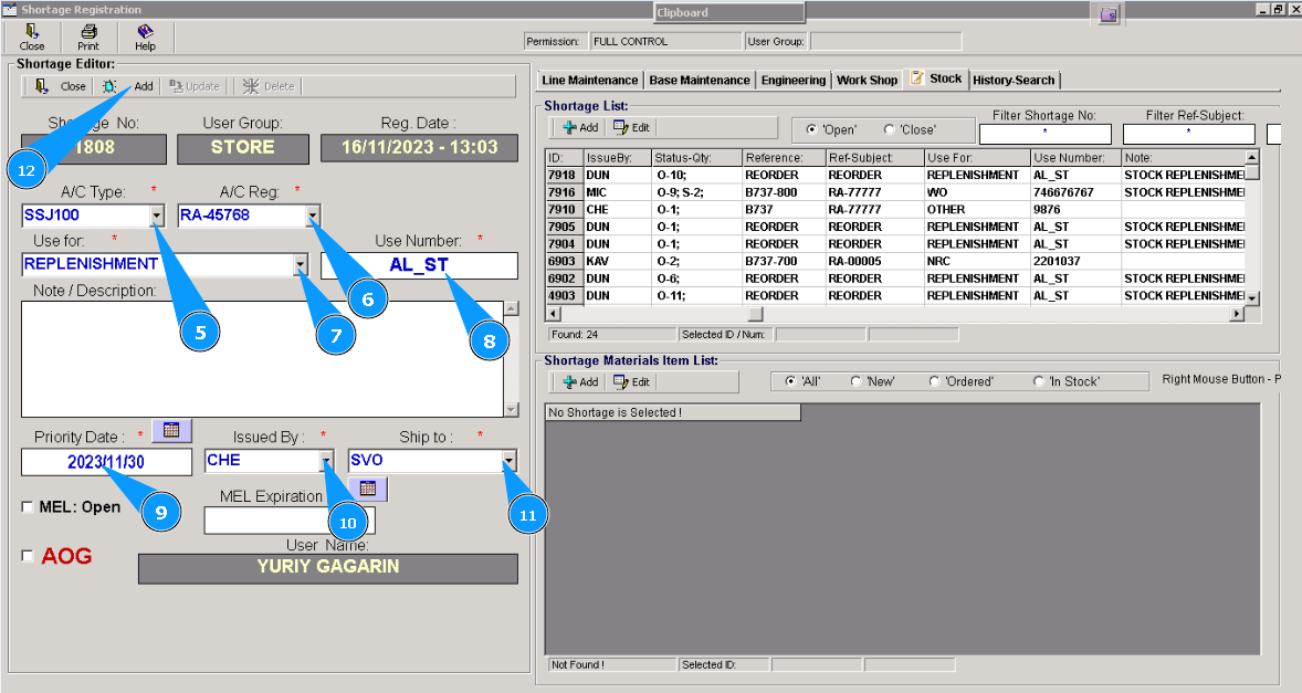 16. Click on the button "Add" in the window "Shortage Material Item List", for adding materials or tools to POR.