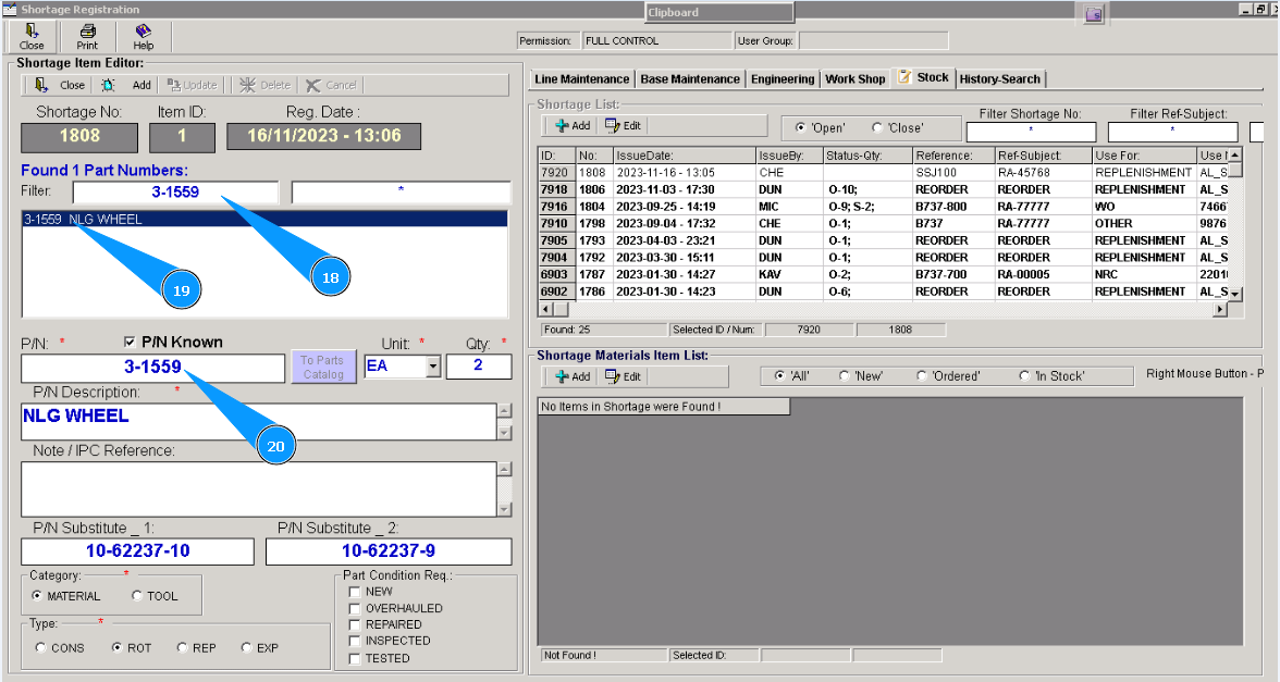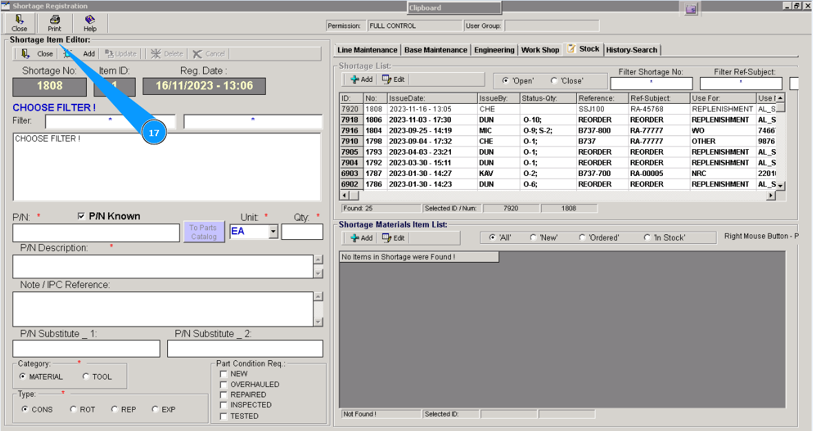 18. Enter the part number of the material or tools in the field "Filter PN" and press the button "Enter" on your keyboard