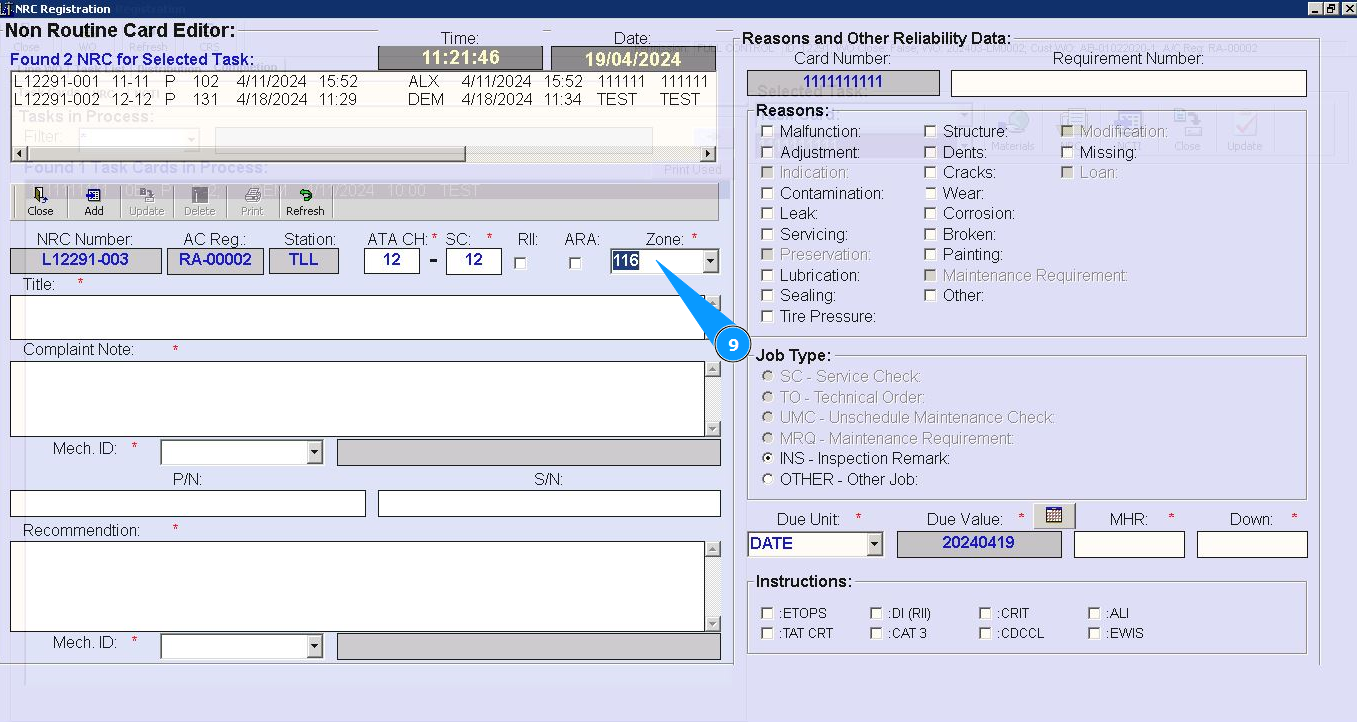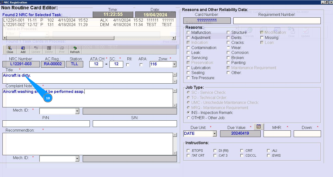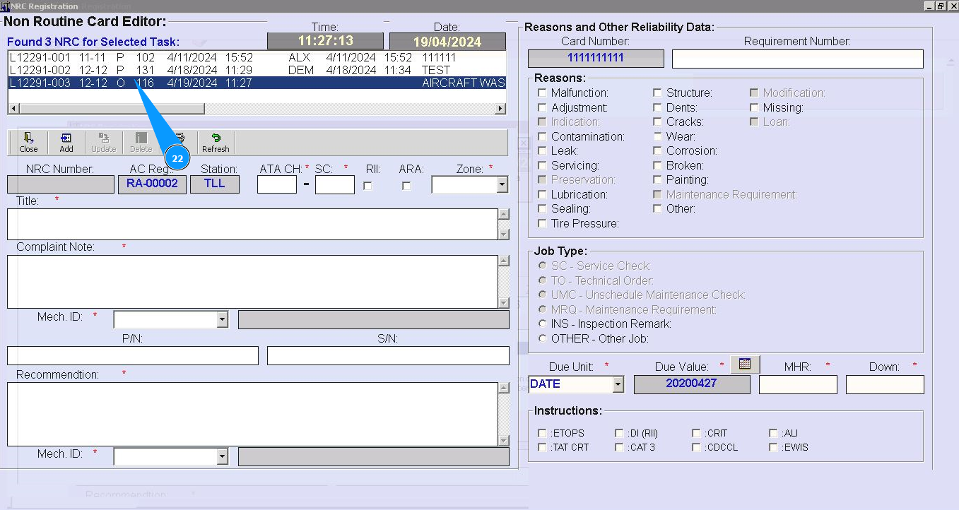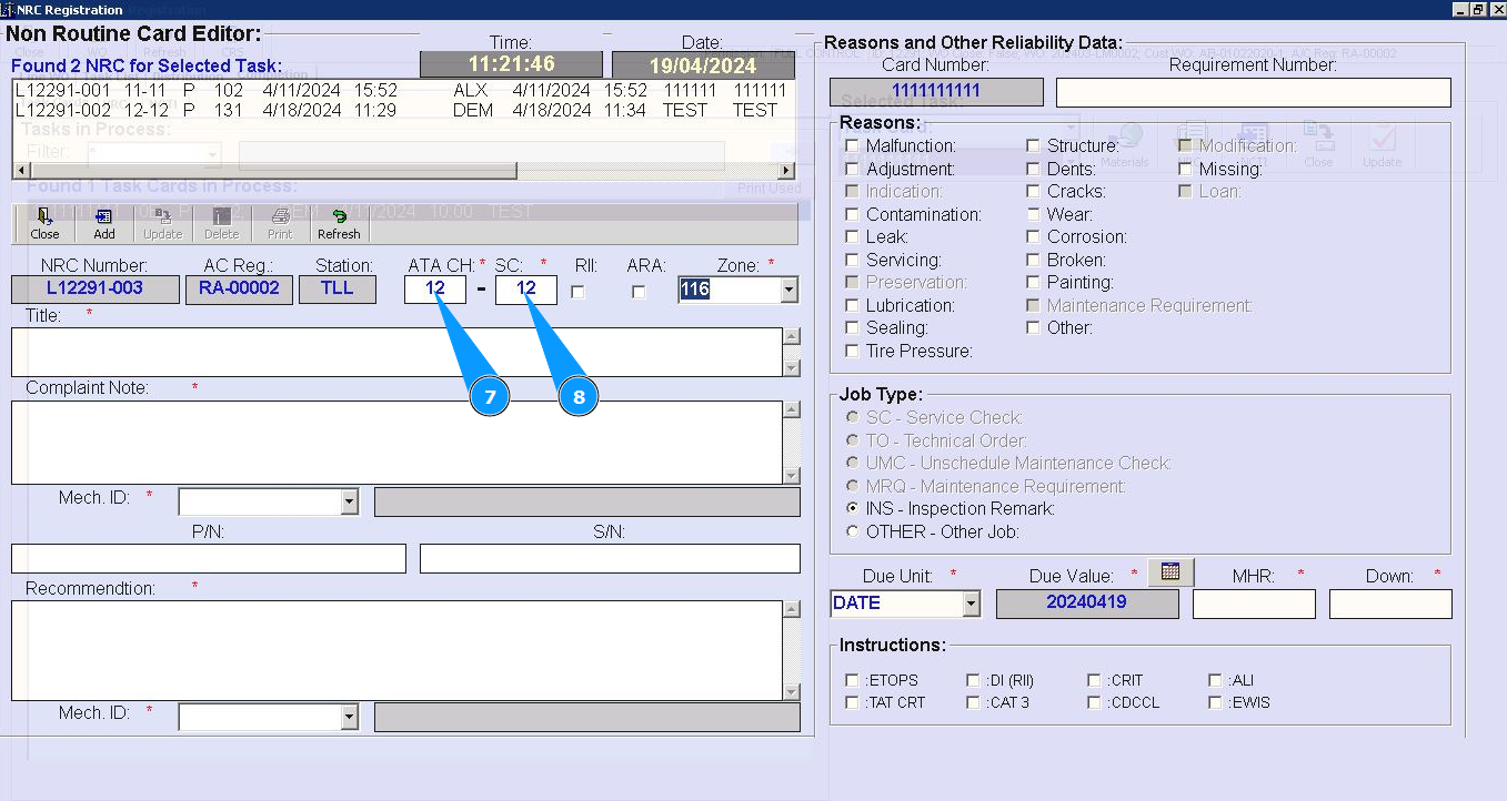 7. Enter number of ATA chapter in the field "ATA CH.". Note: Fields are :"NRC Number", "AC Reg.", "Station" automatically filled in from Task Card data.