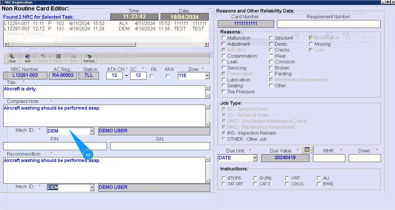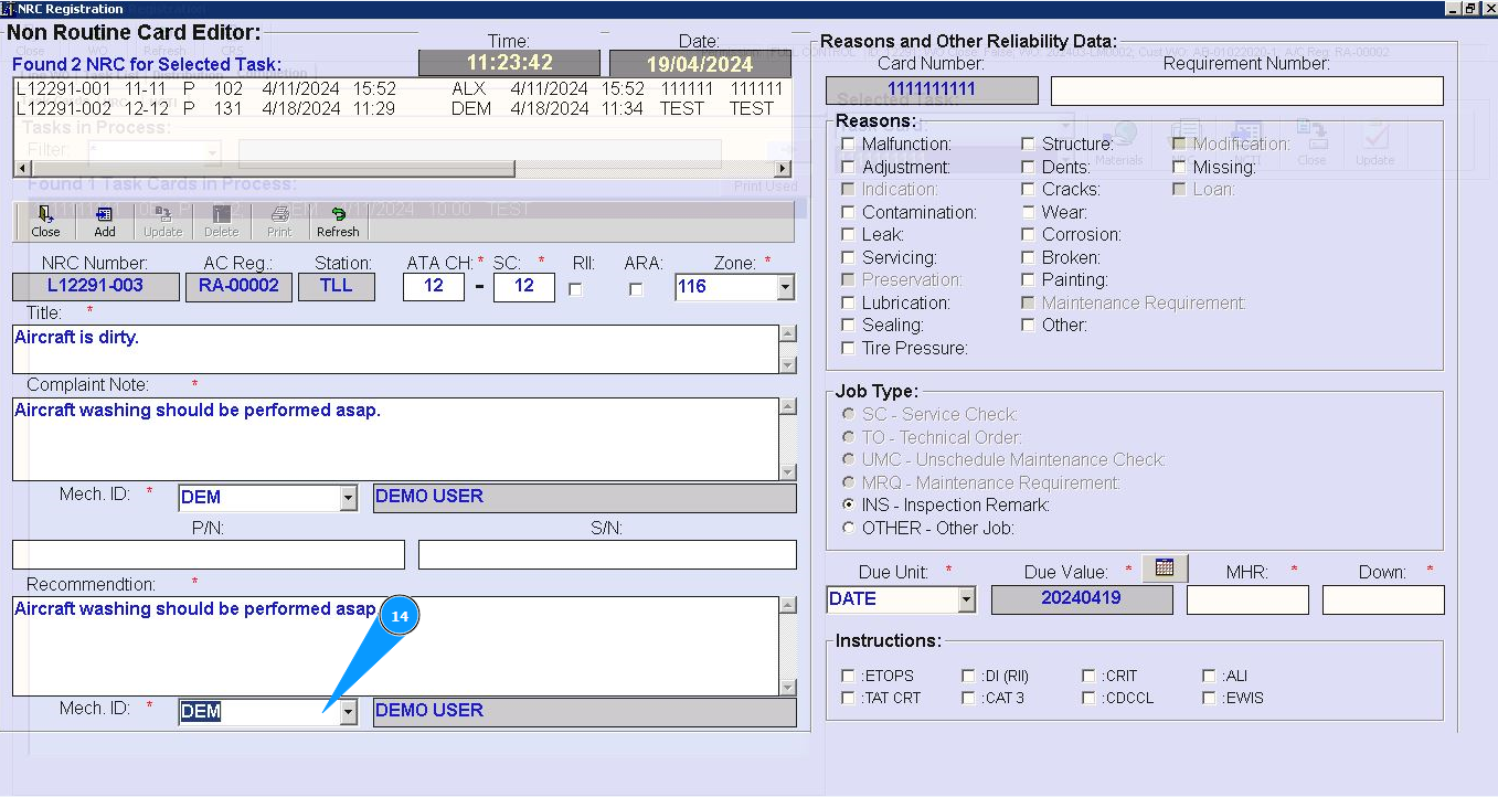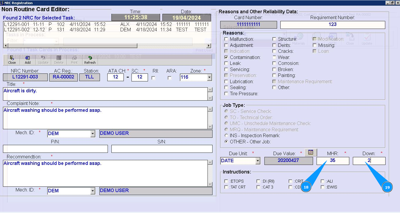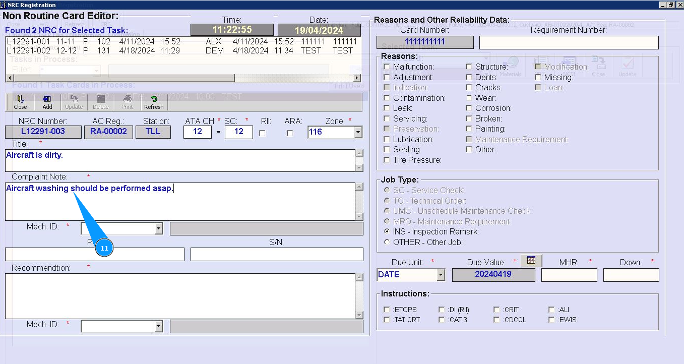 7. Enter number of ATA chapter in the field "ATA CH.". Note: Fields are :"NRC Number", "AC Reg.", "Station" automatically filled in from Task Card data.