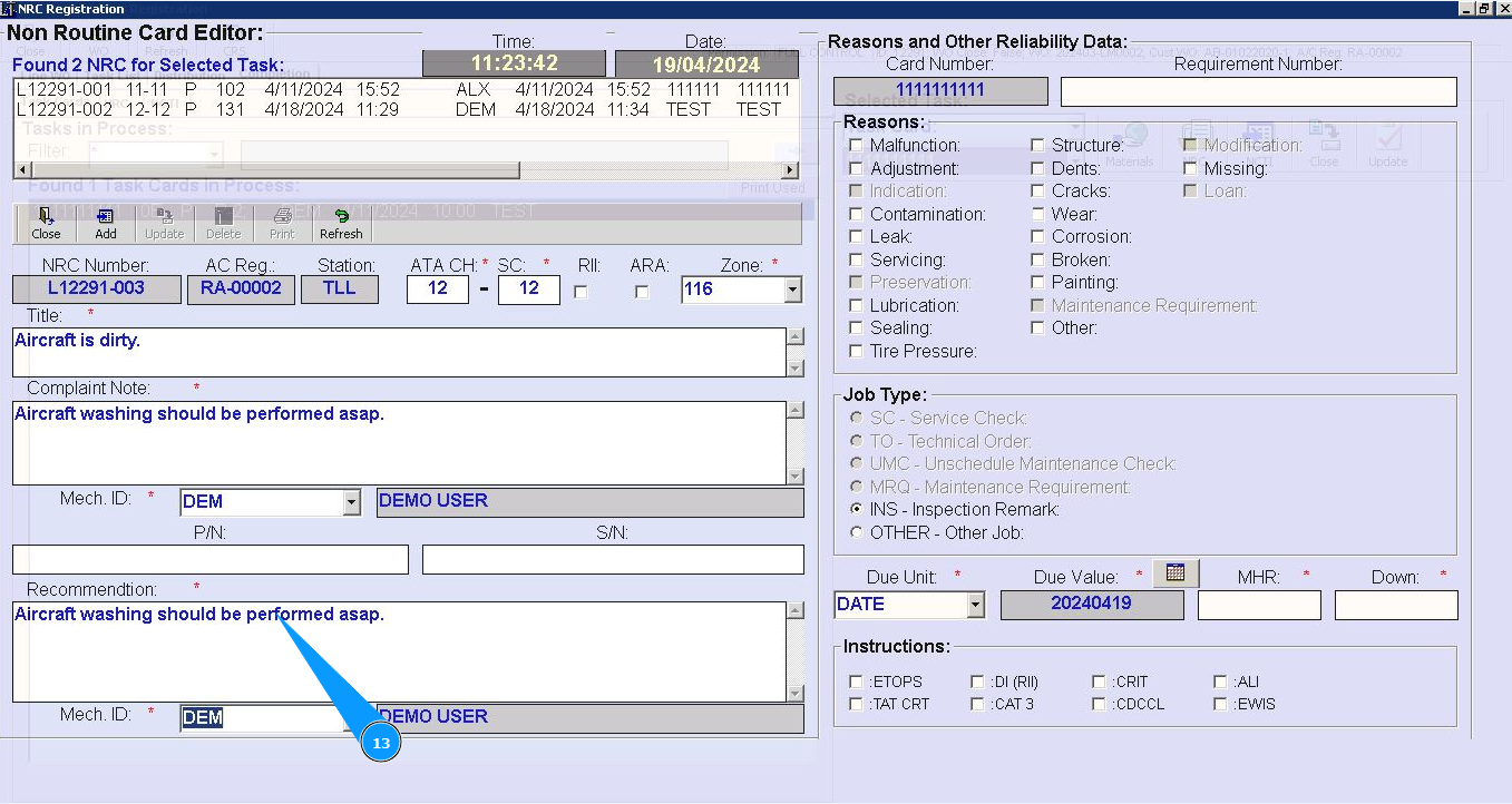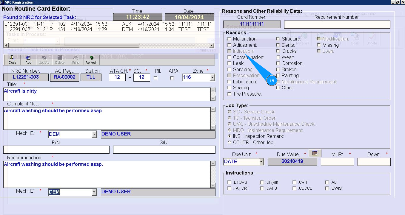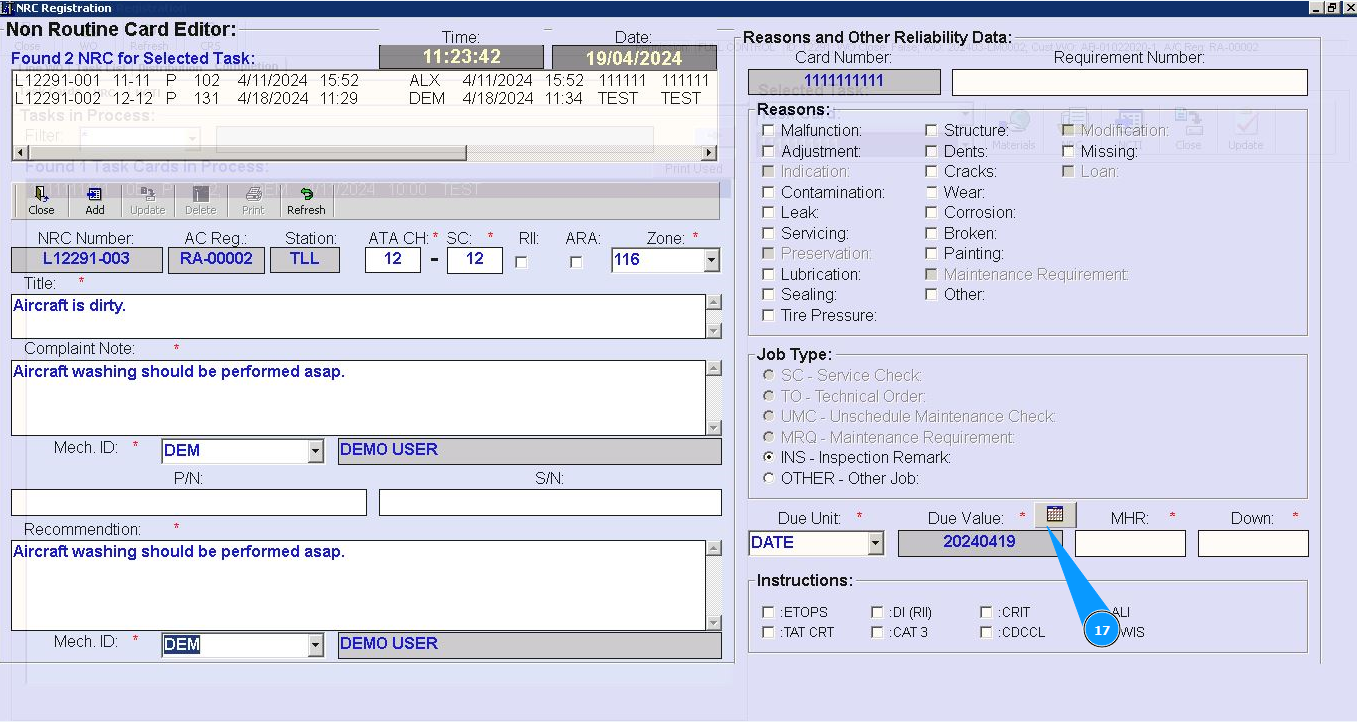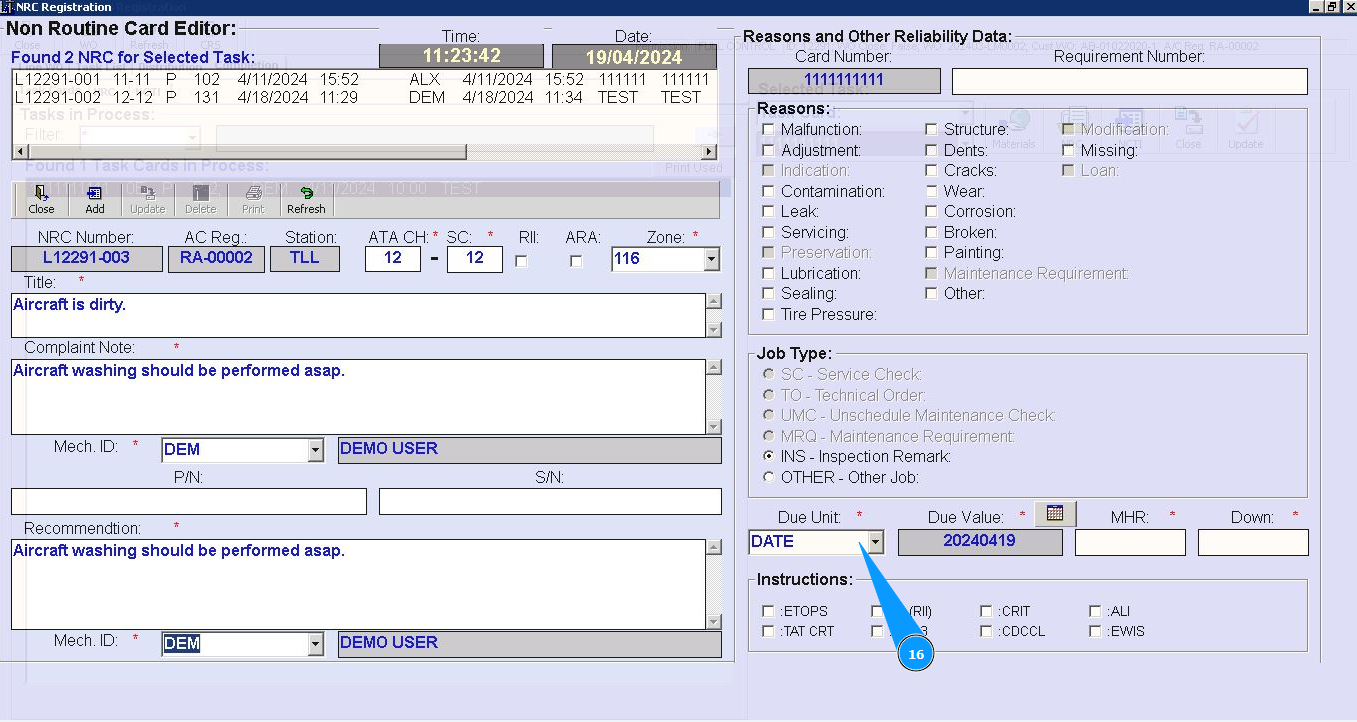 16. Select from the dropdown list the units of time when you want to perform NRC (date, hours or cycles) in the field "Due Unit".
