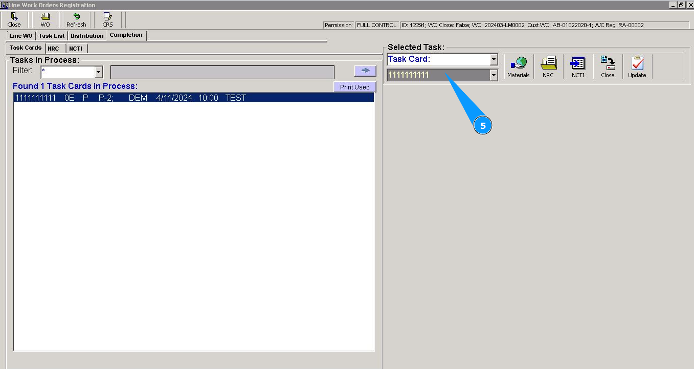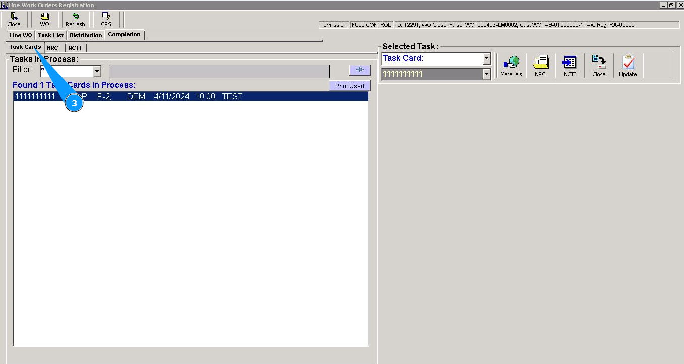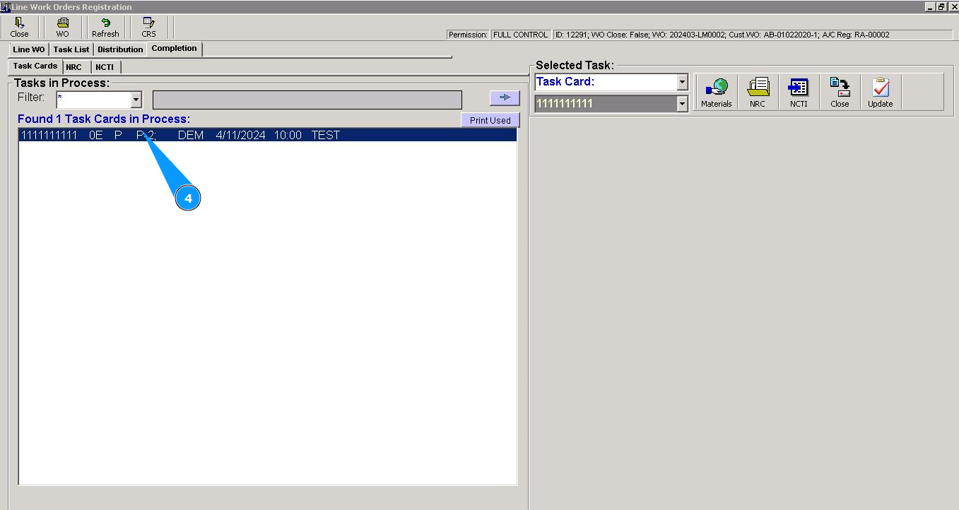 4. Select the required task card from the list and click on the corresponding line in the window "Task Card in process".