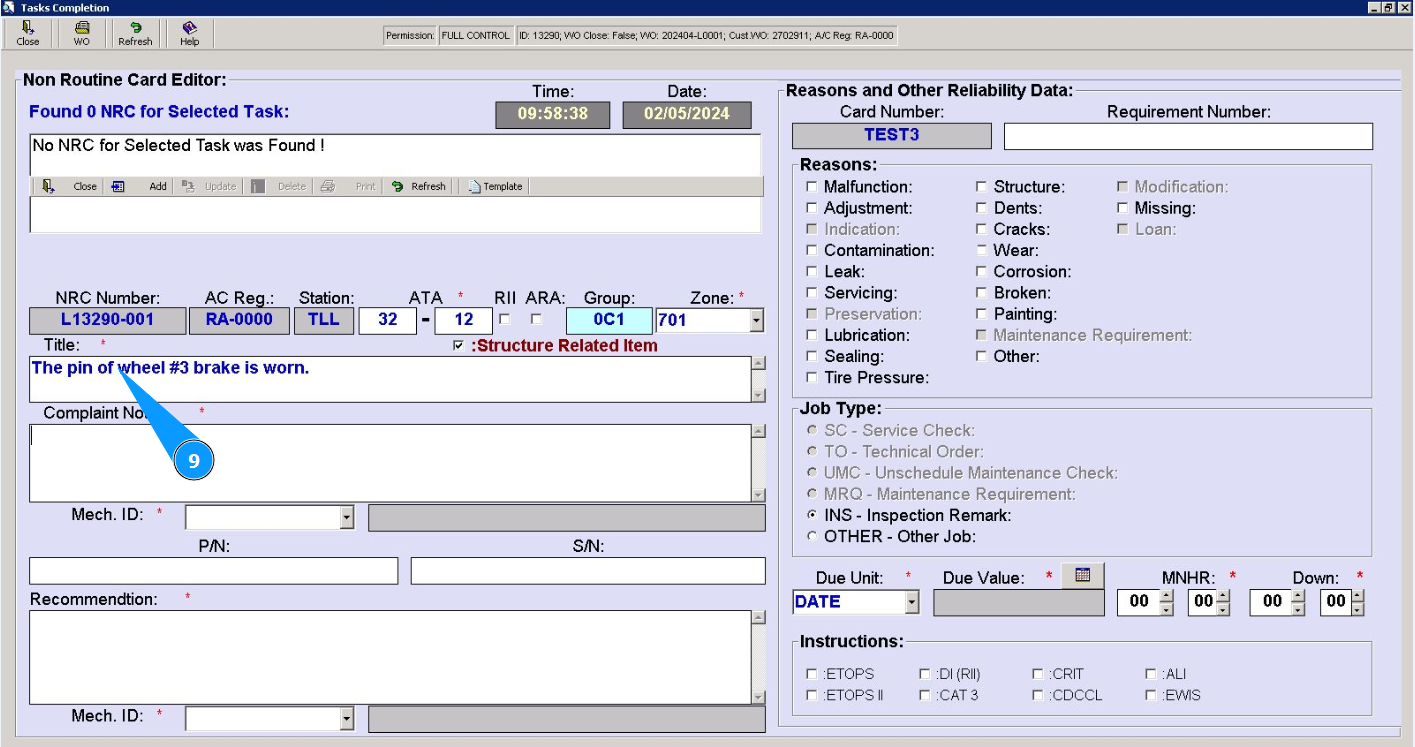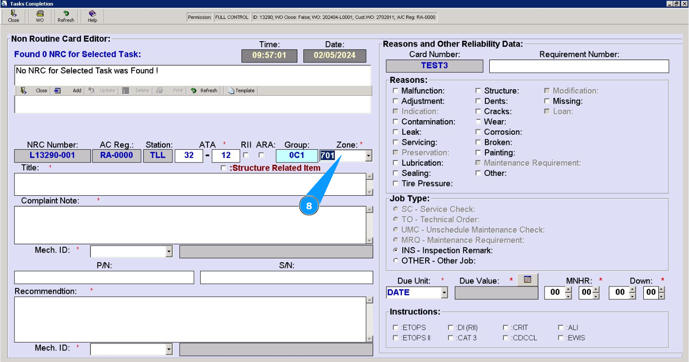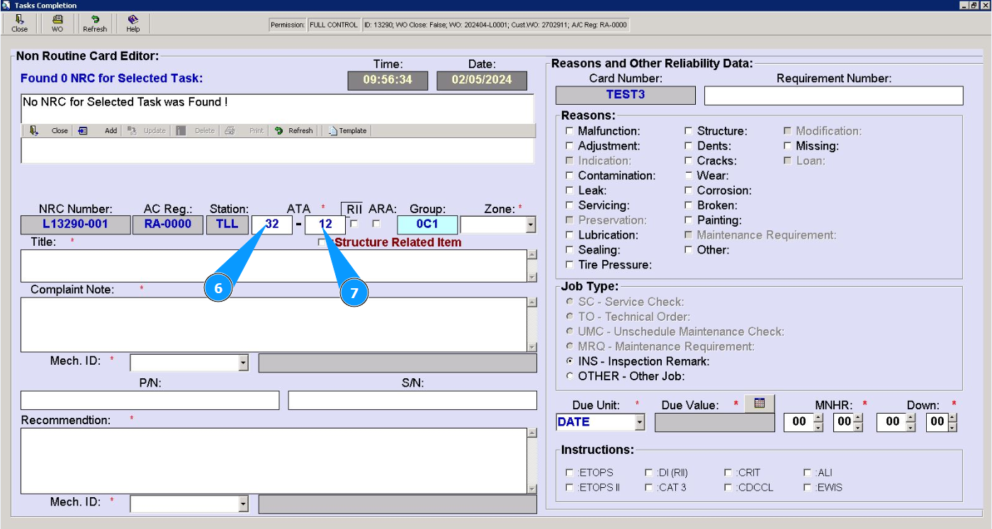 6. Enter number of ATA chapter in the field "ATA". Note: Fields are :"NRC Number", "AC Reg.", "Station" automatically filled in from the selected task.