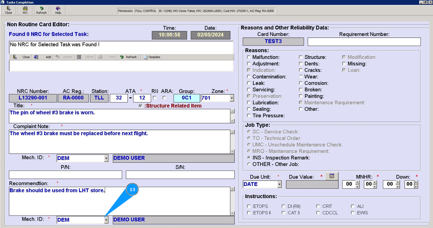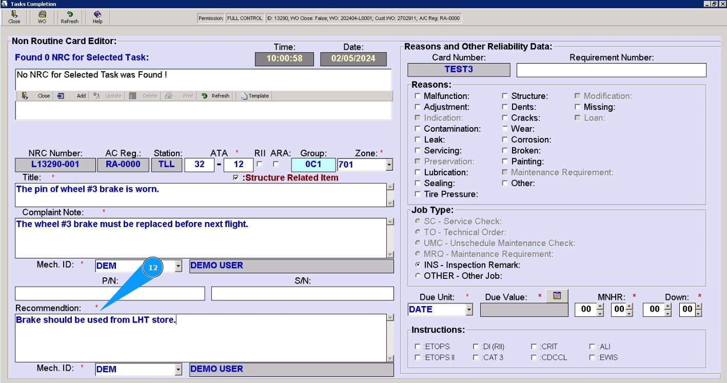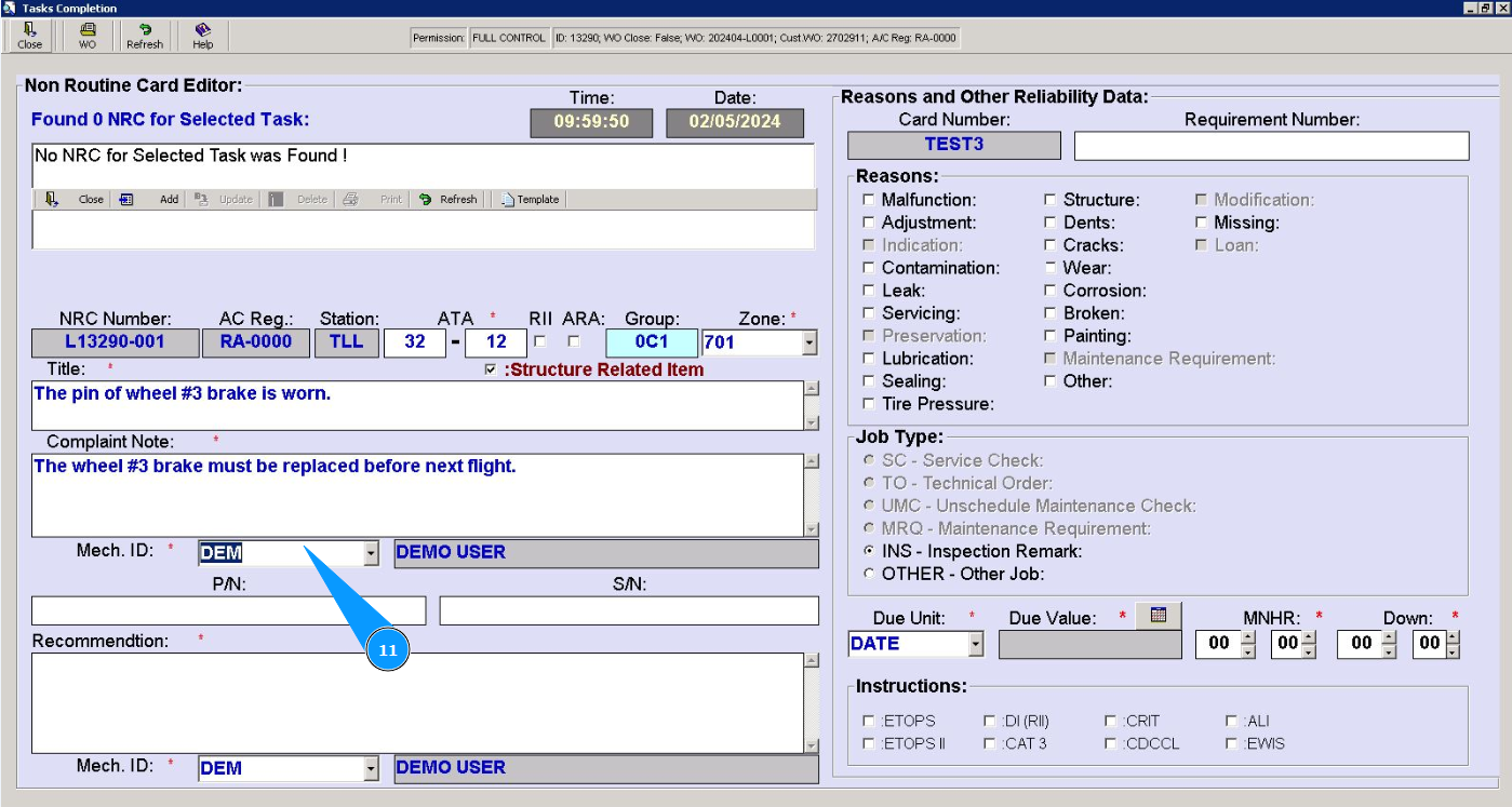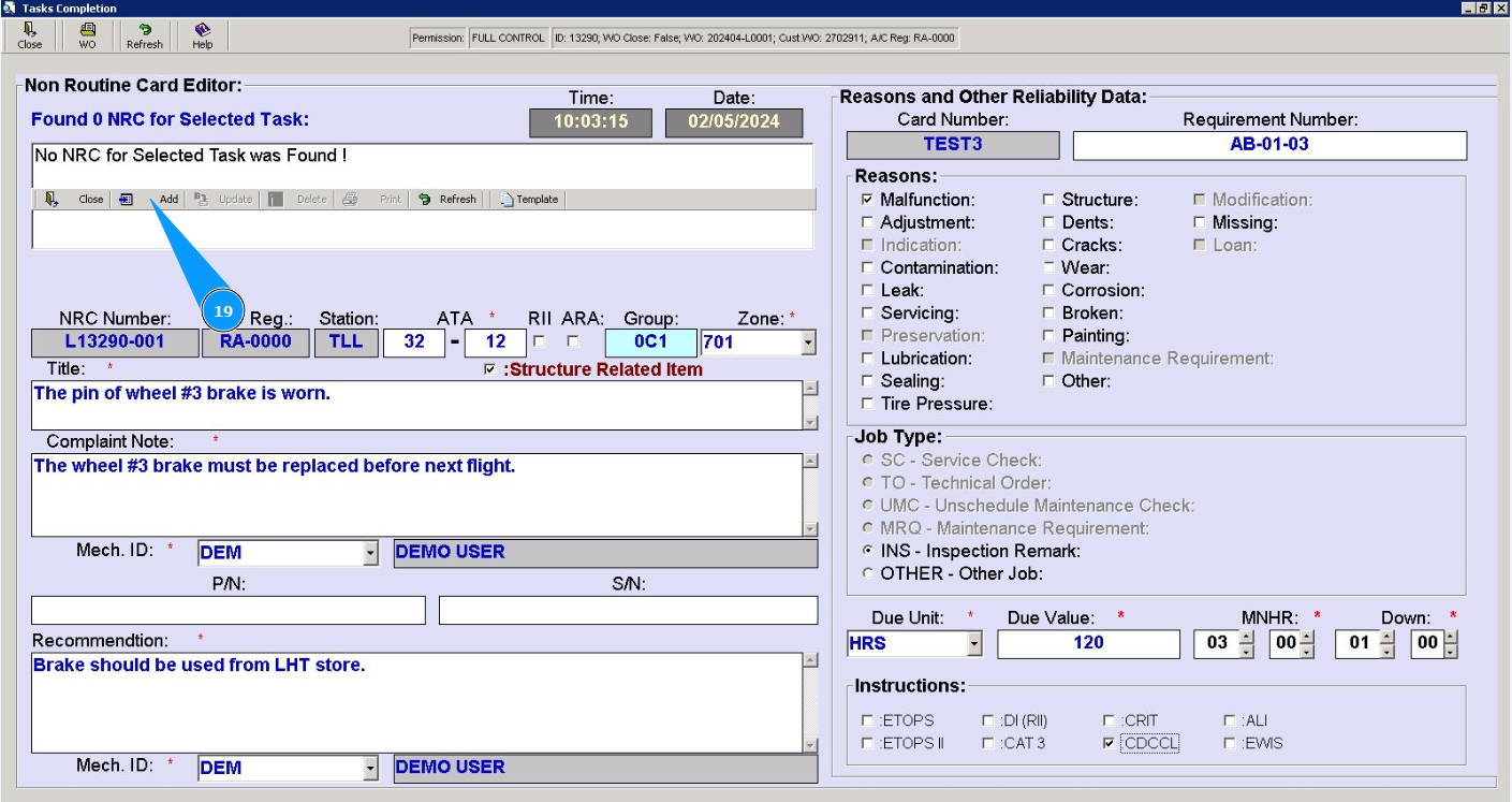 6. Enter number of ATA chapter in the field "ATA". Note: Fields are :"NRC Number", "AC Reg.", "Station" automatically filled in from the selected task.