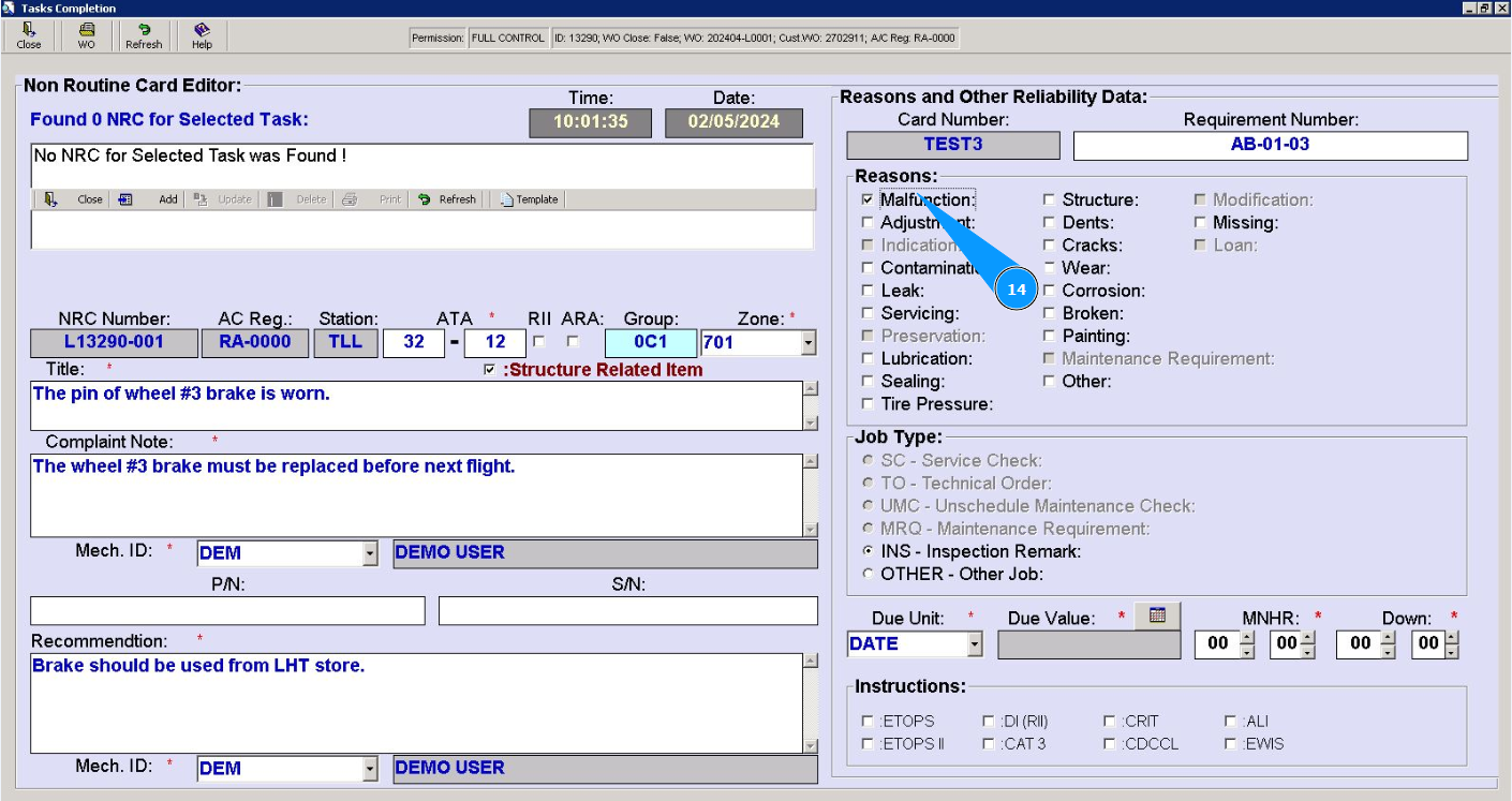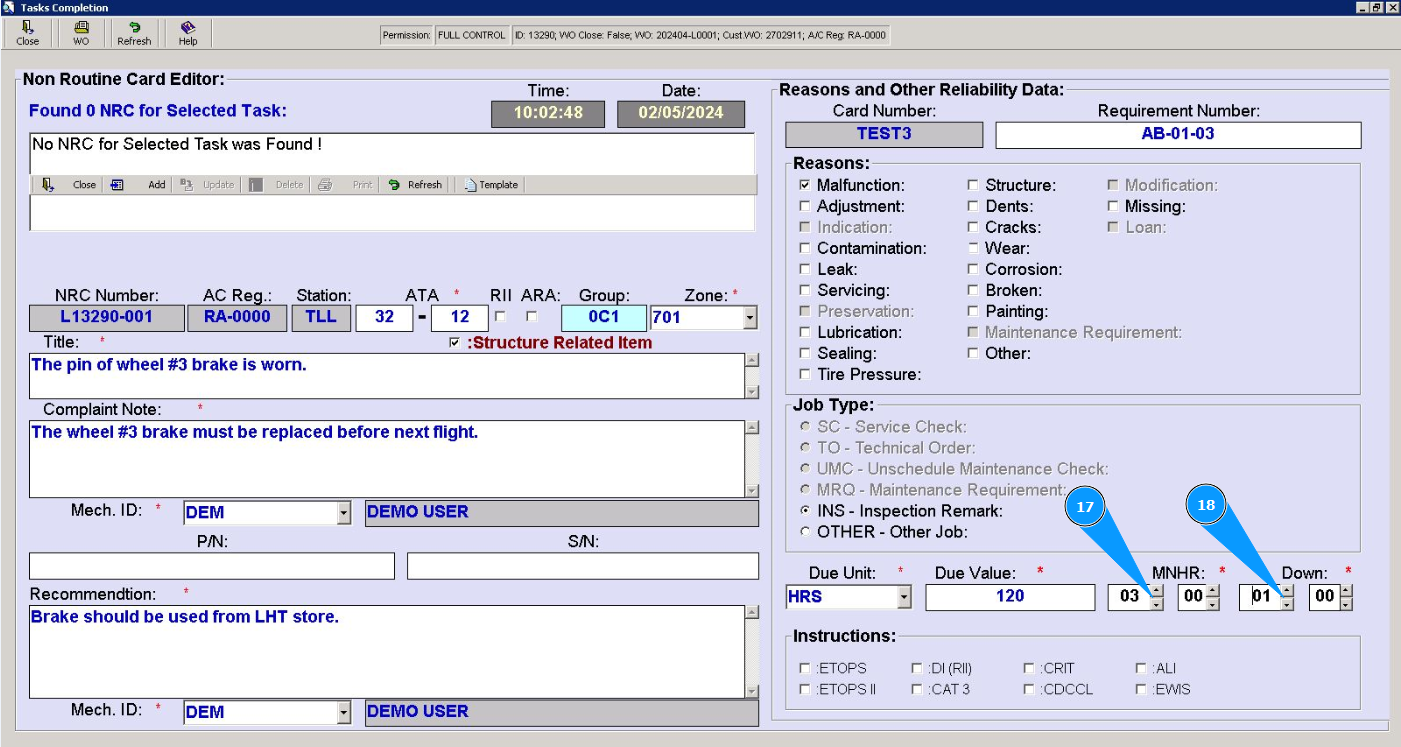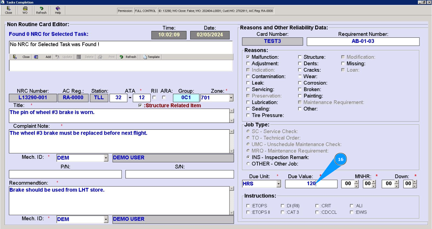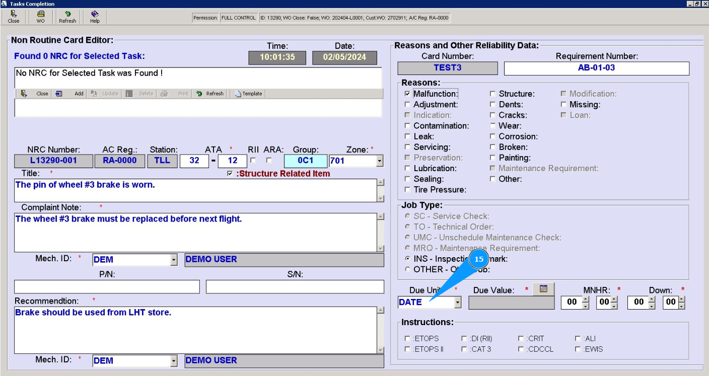 15. Select from the dropdown list the units of time when you want to perform NRC (date, hours or cycles) in the field "Due Unit".