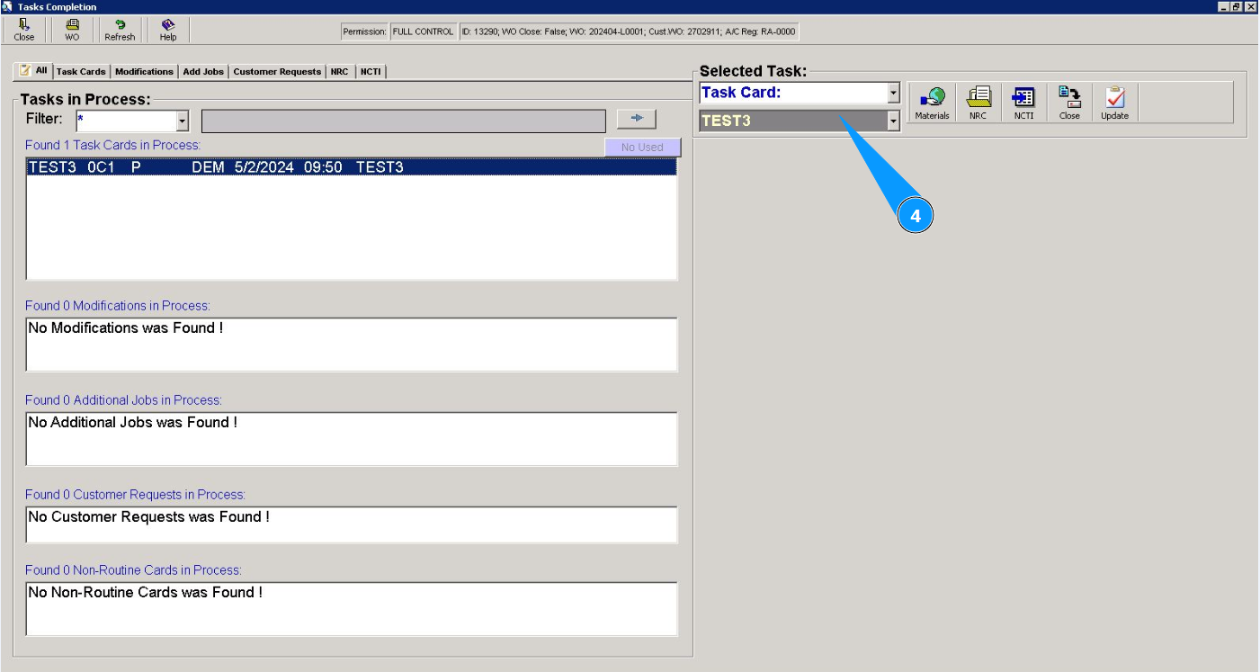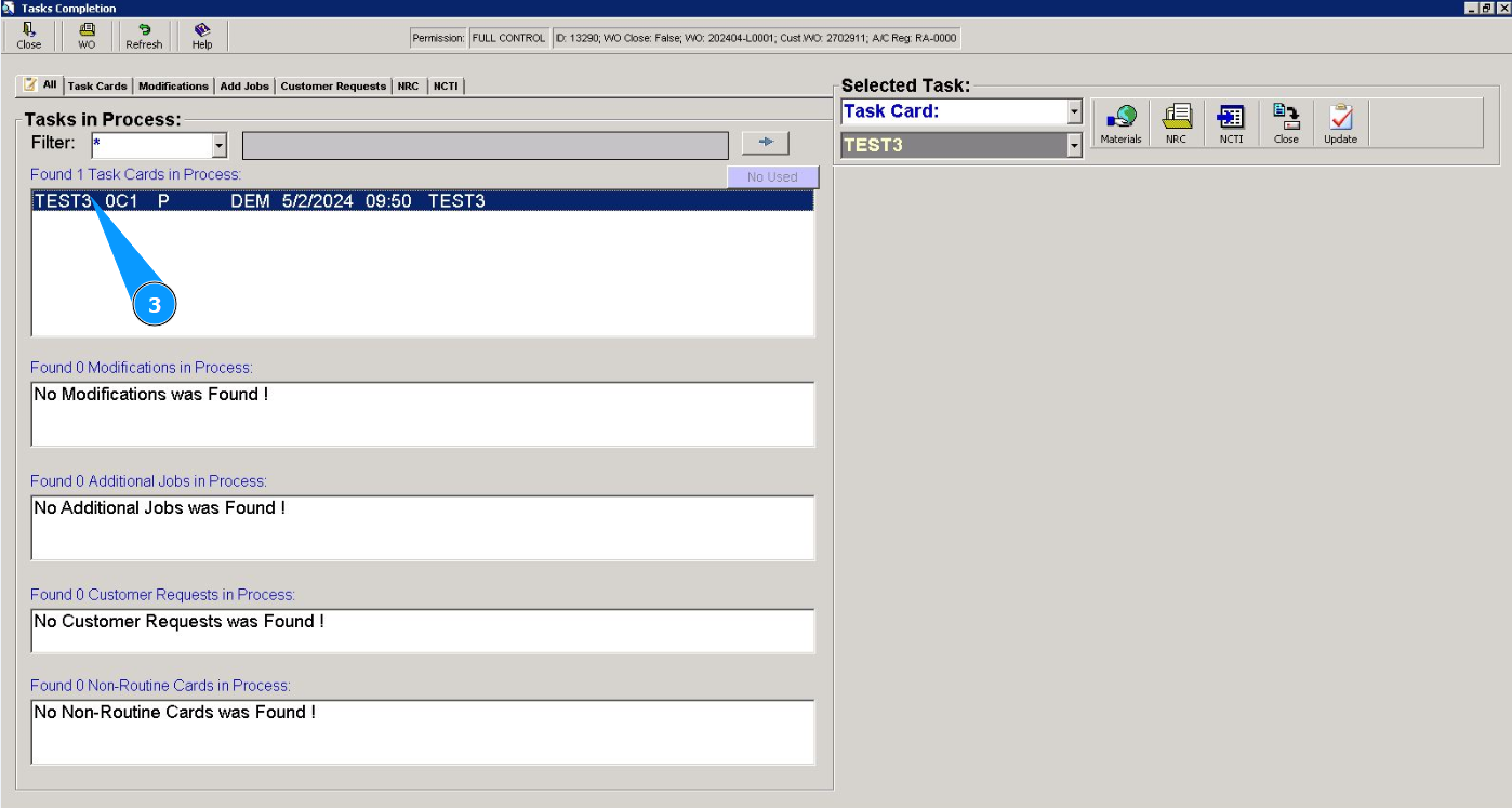 3. Select the required task card from the list and click on the corresponding line in the window "Tasks in Process".