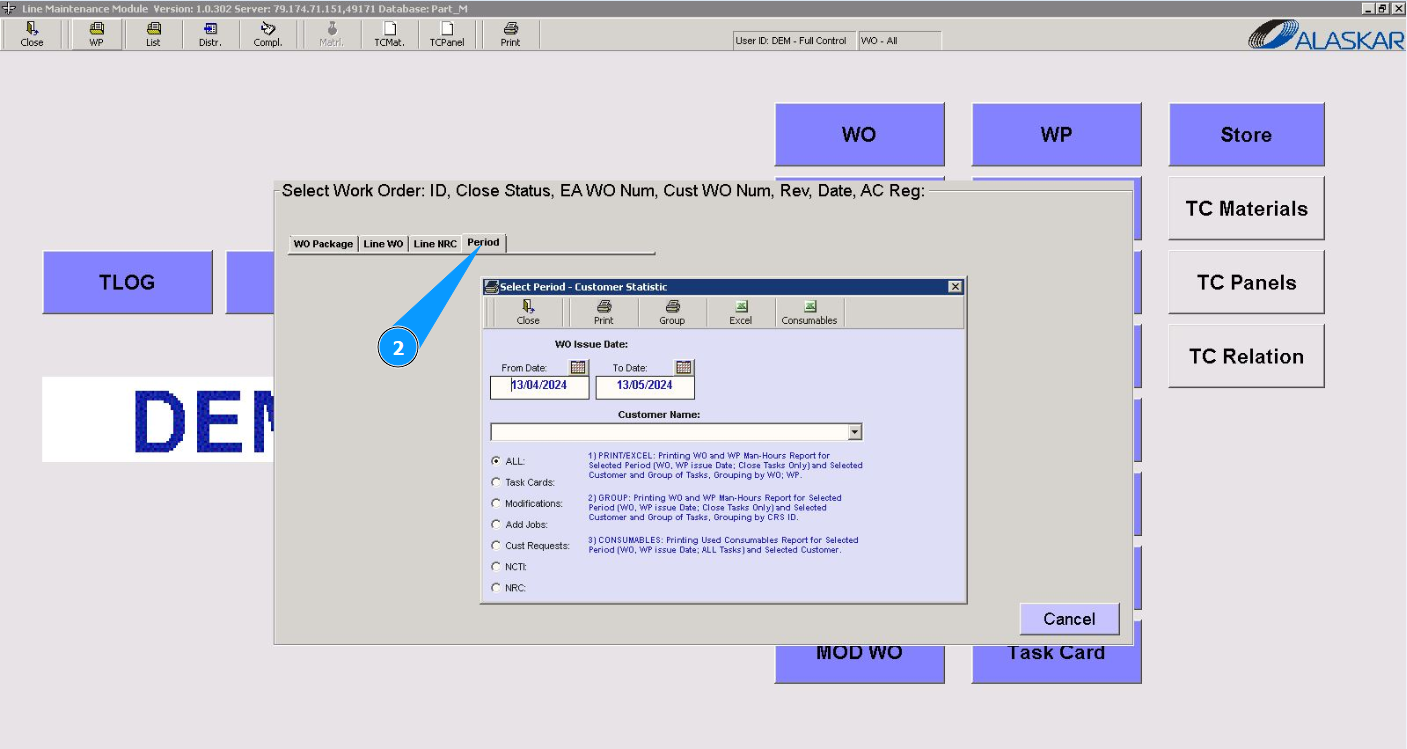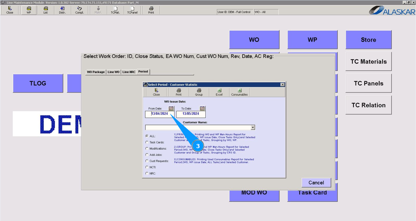 3. Select the required report for period in the window "Work Order Issue Date". Note: If necessary, select additional criteria for displaying a report in the fields of the window: "Select Period-Customer Statistic".
