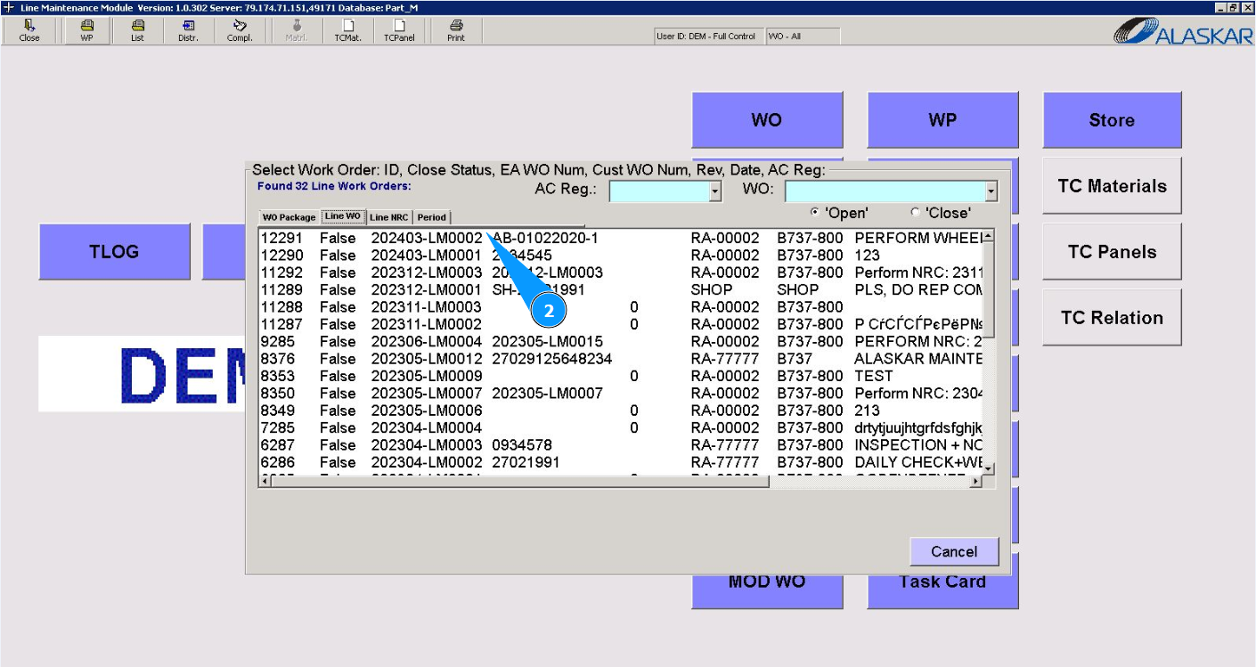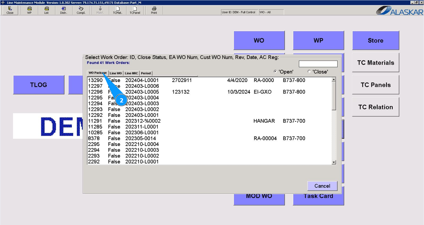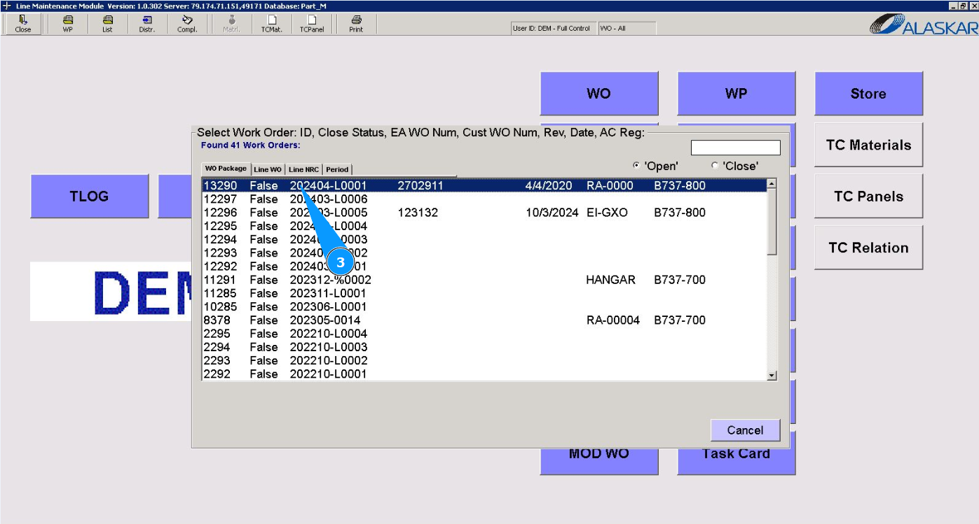3. Select the required LWO report to check it or print it from the provided list in the window "Select Work Order" and double click on the corresponding line. Note: Check that the filter is set "open" in the field: "Open".
