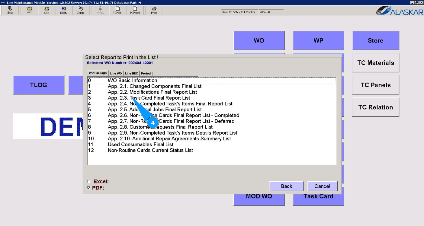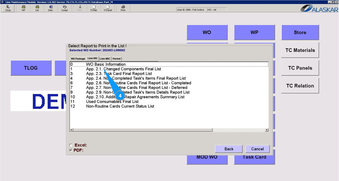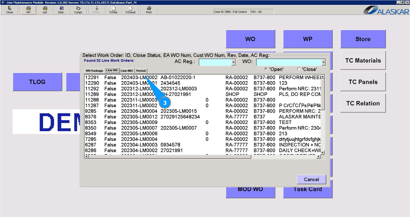 3. Select the required LWO report to check it or print it from the provided list in the window "Select Work Order" and double click on the corresponding line. Note: Check that the filter is set "open" in the field: "Open".