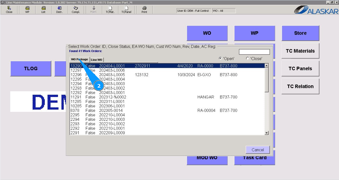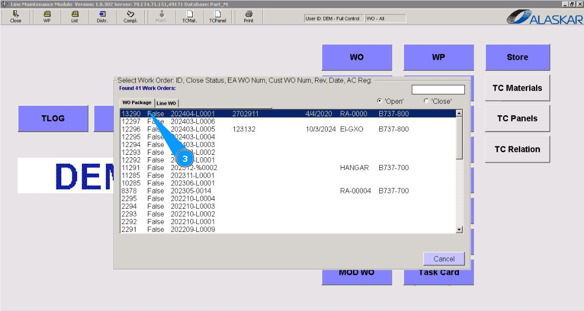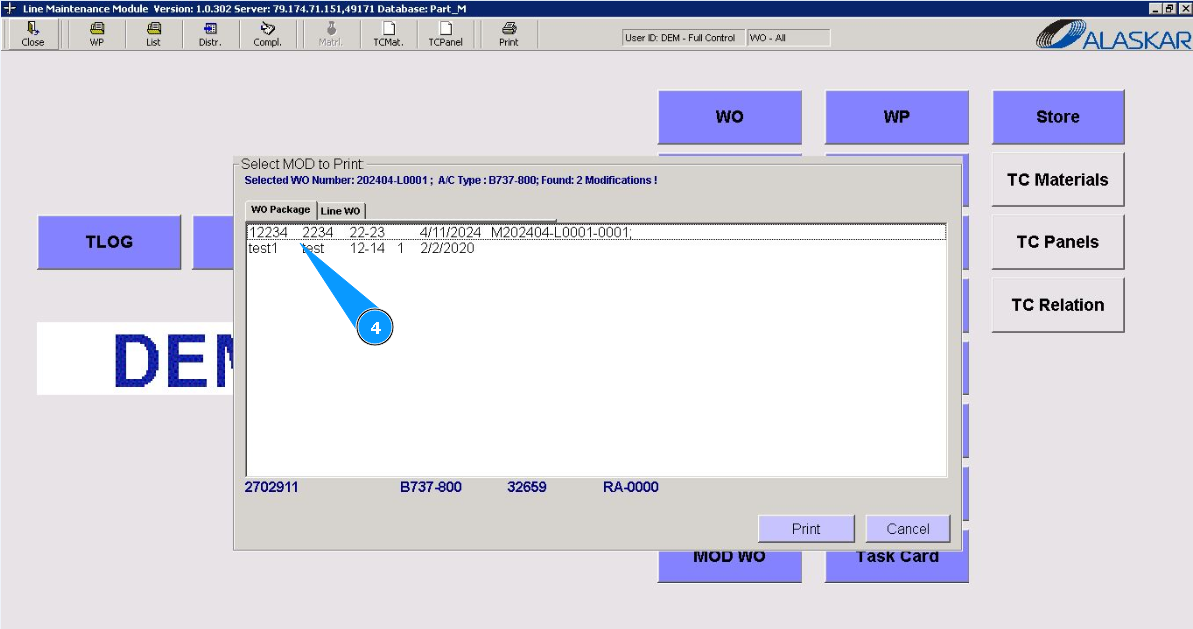 3. Select the Work package to print the modification form from the list provided and double click on the corresponding line.