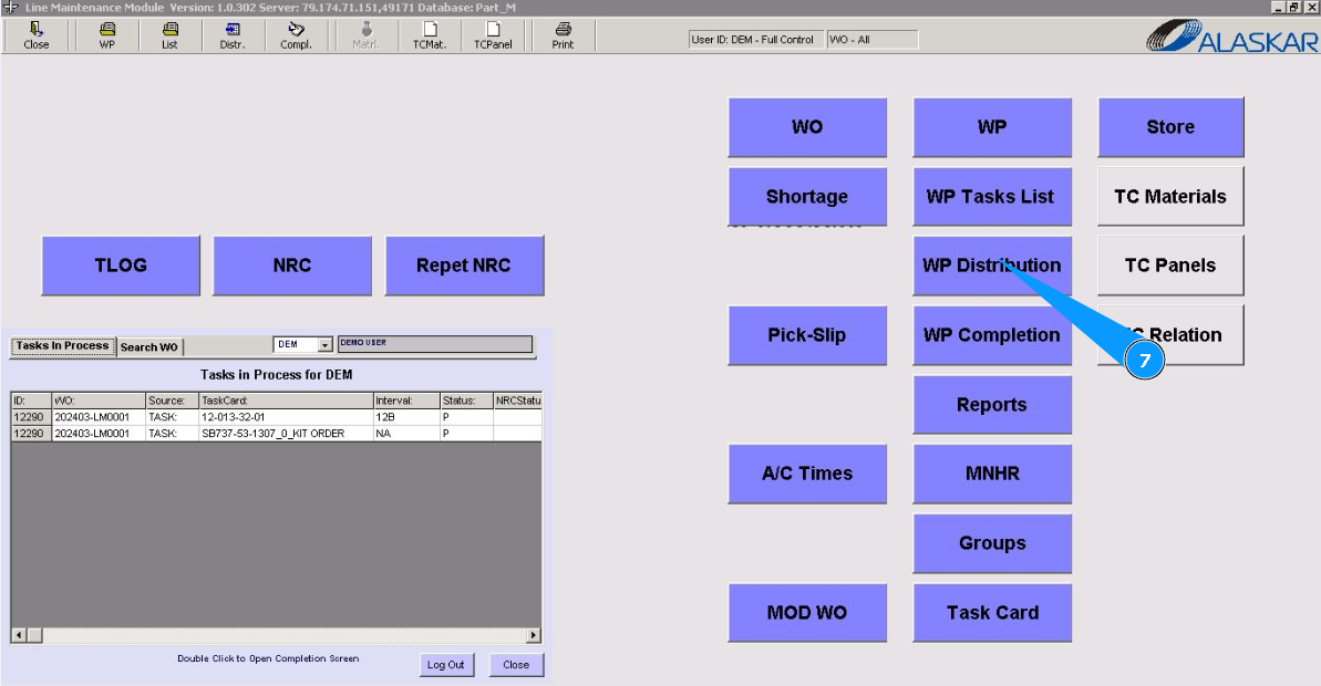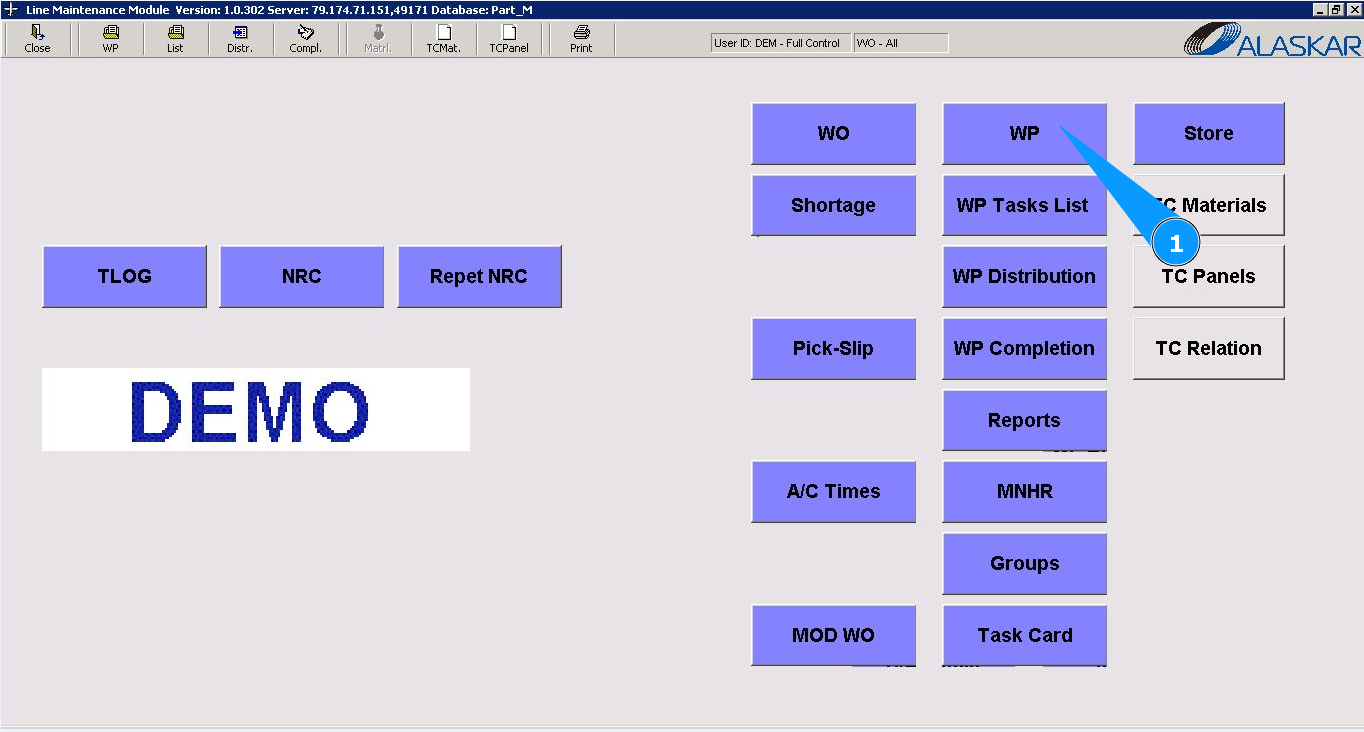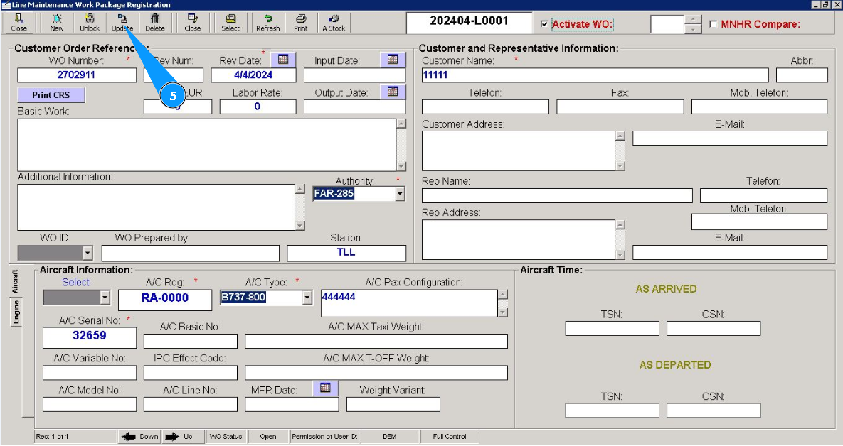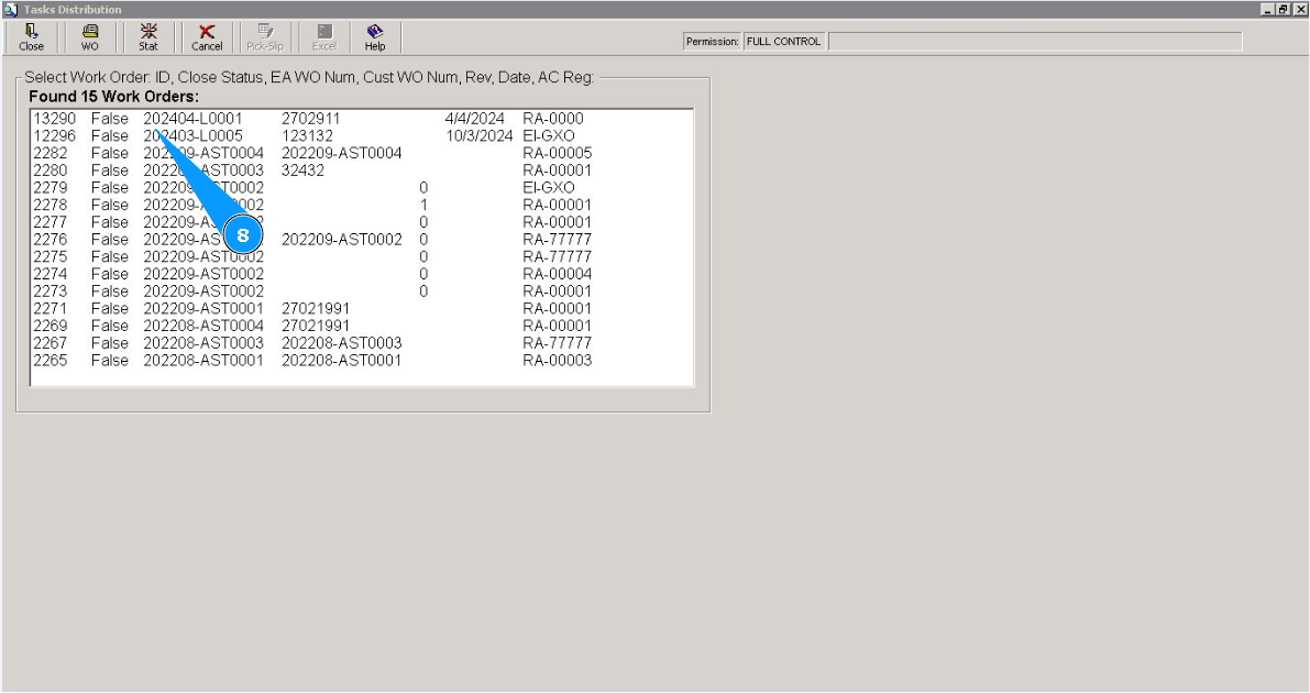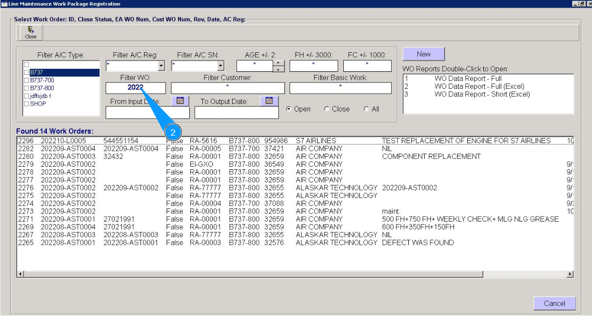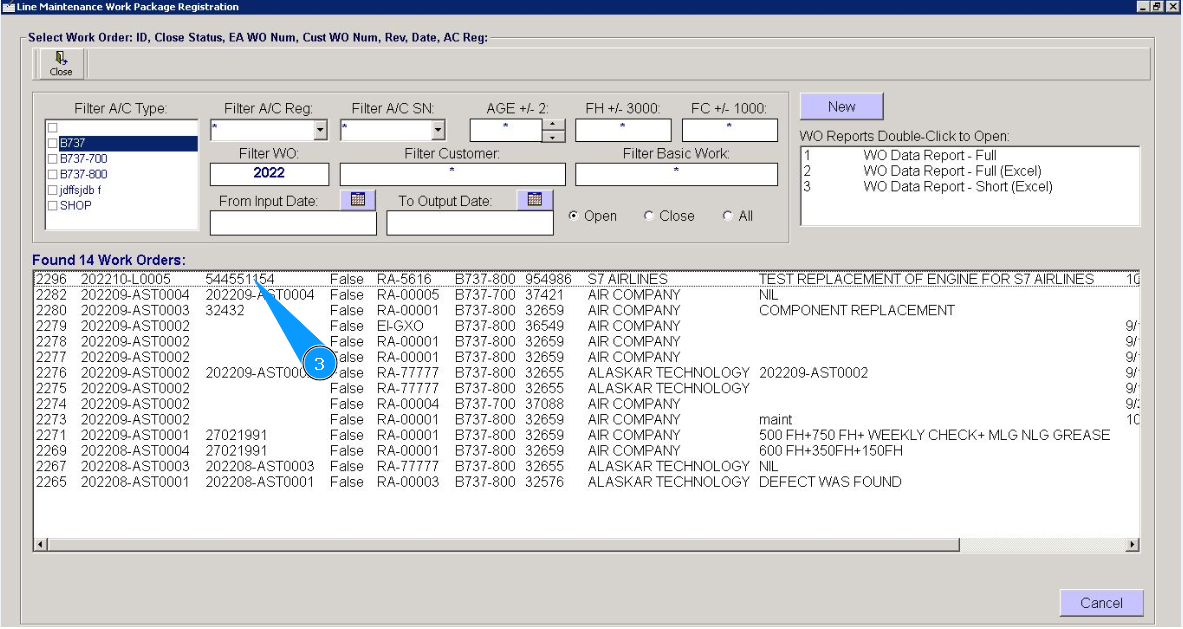 2. Enter the WO number in the field "Filter WO" and press the knob "Enter" on your keyboard. Note: If necessary, use other search filters in the fields: "Filter A/C Reg.", "Filter A/C SN", "Filter Customer" etc.
