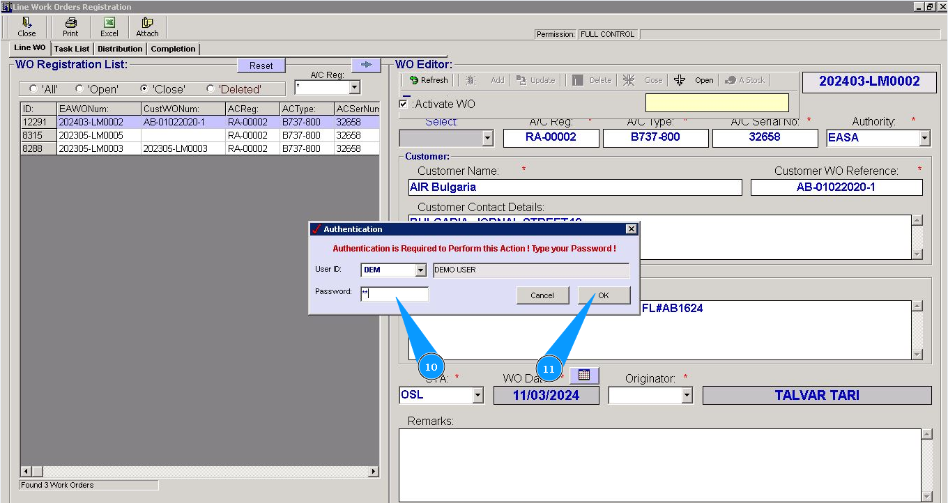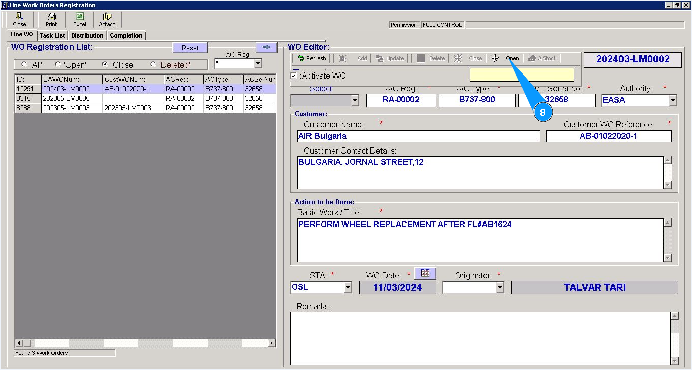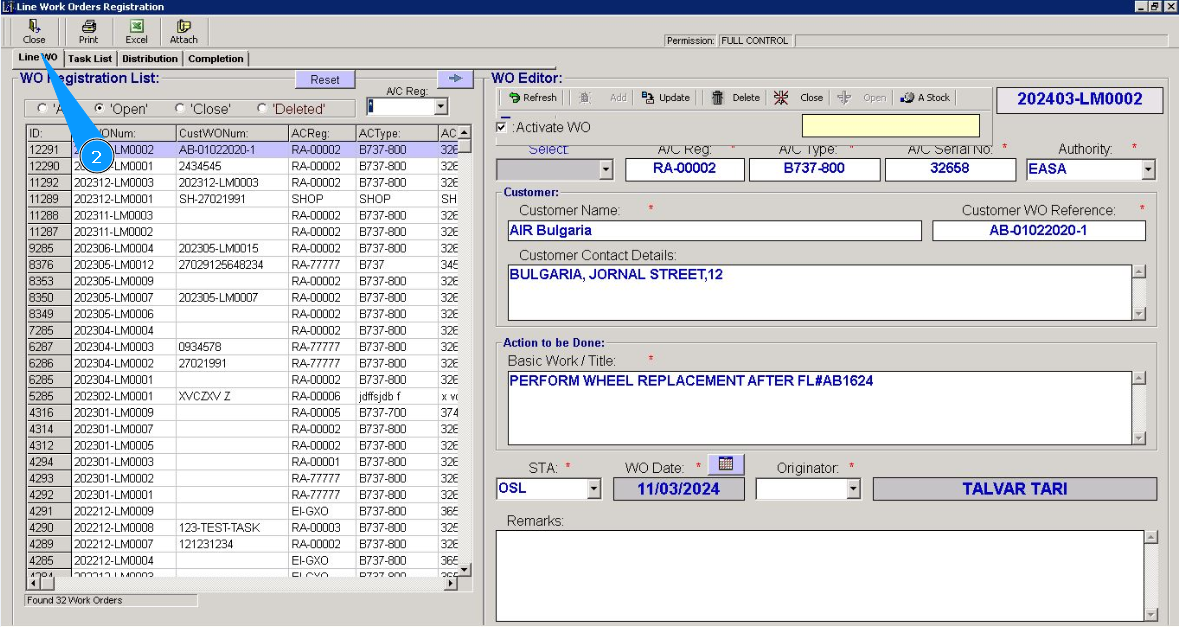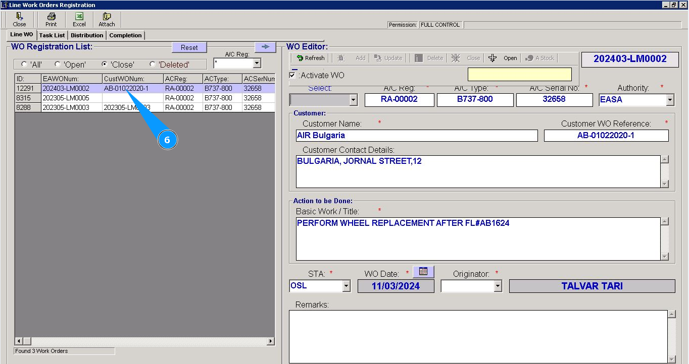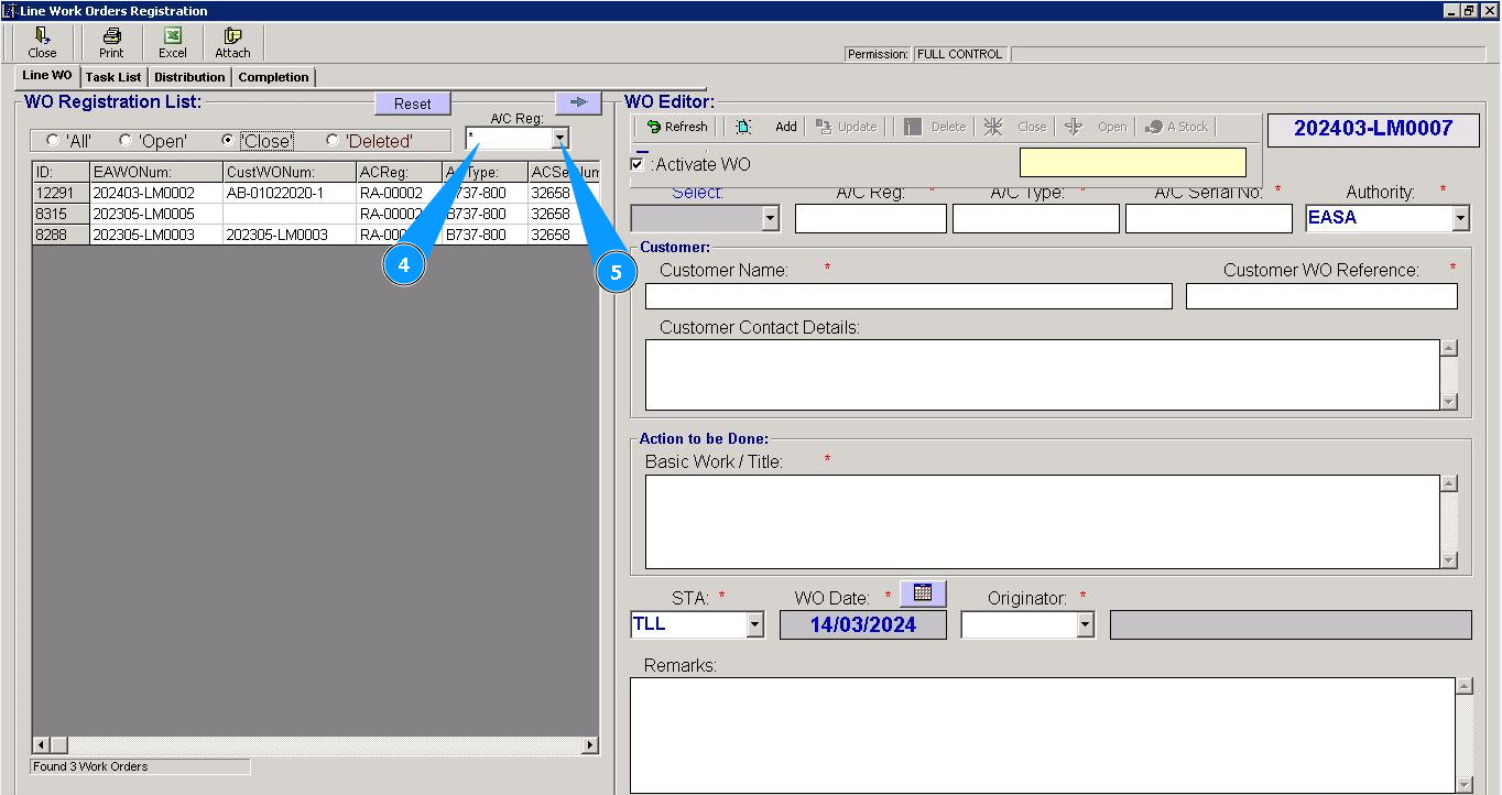 6. Select the required WO number for closing from the list in the window "WO Registration List". Click on the line with WO.