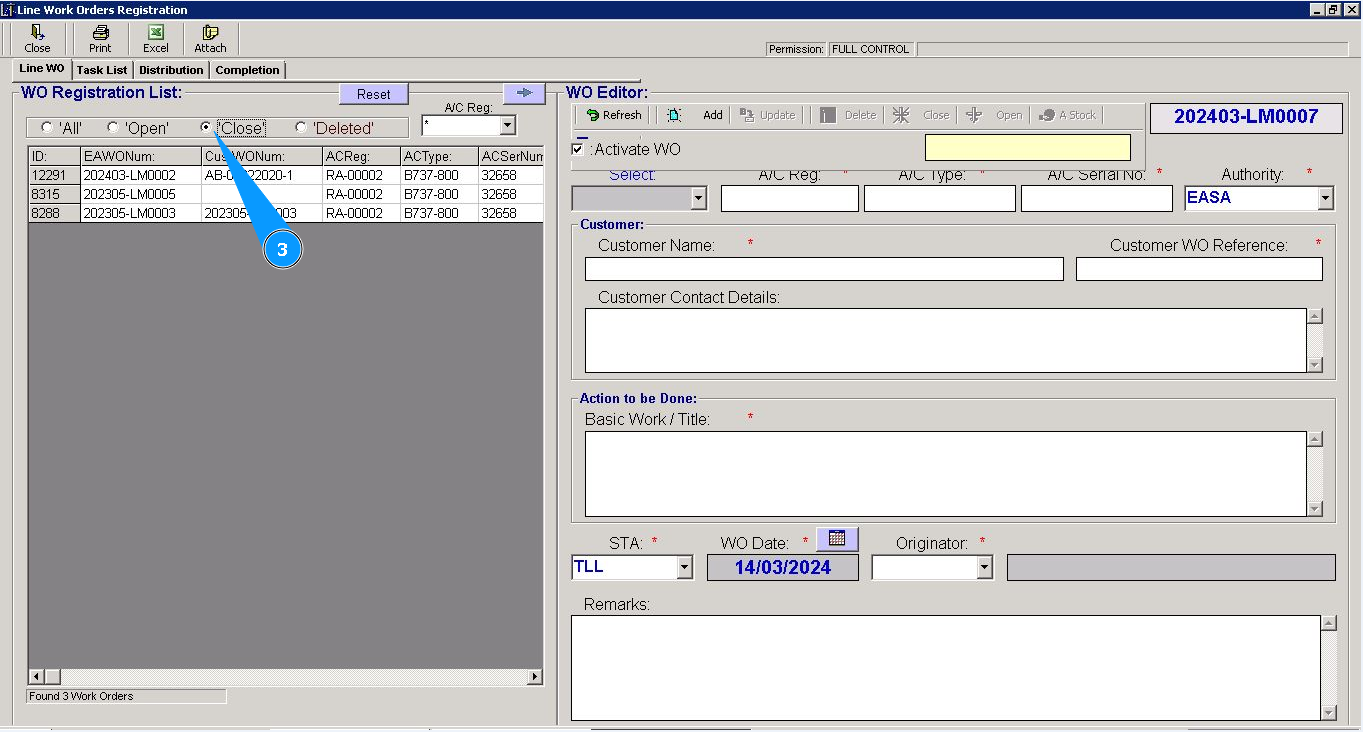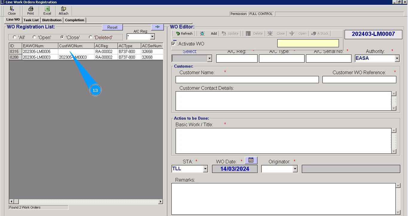 13. Check that the Work Order record has disappeared from the list of closed WOs in the window "WO Registration List".