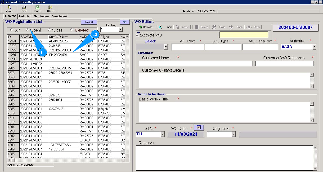 15. Make sure that the record with Work Order is displayed in the list of opened works in the window "WO Registration List".