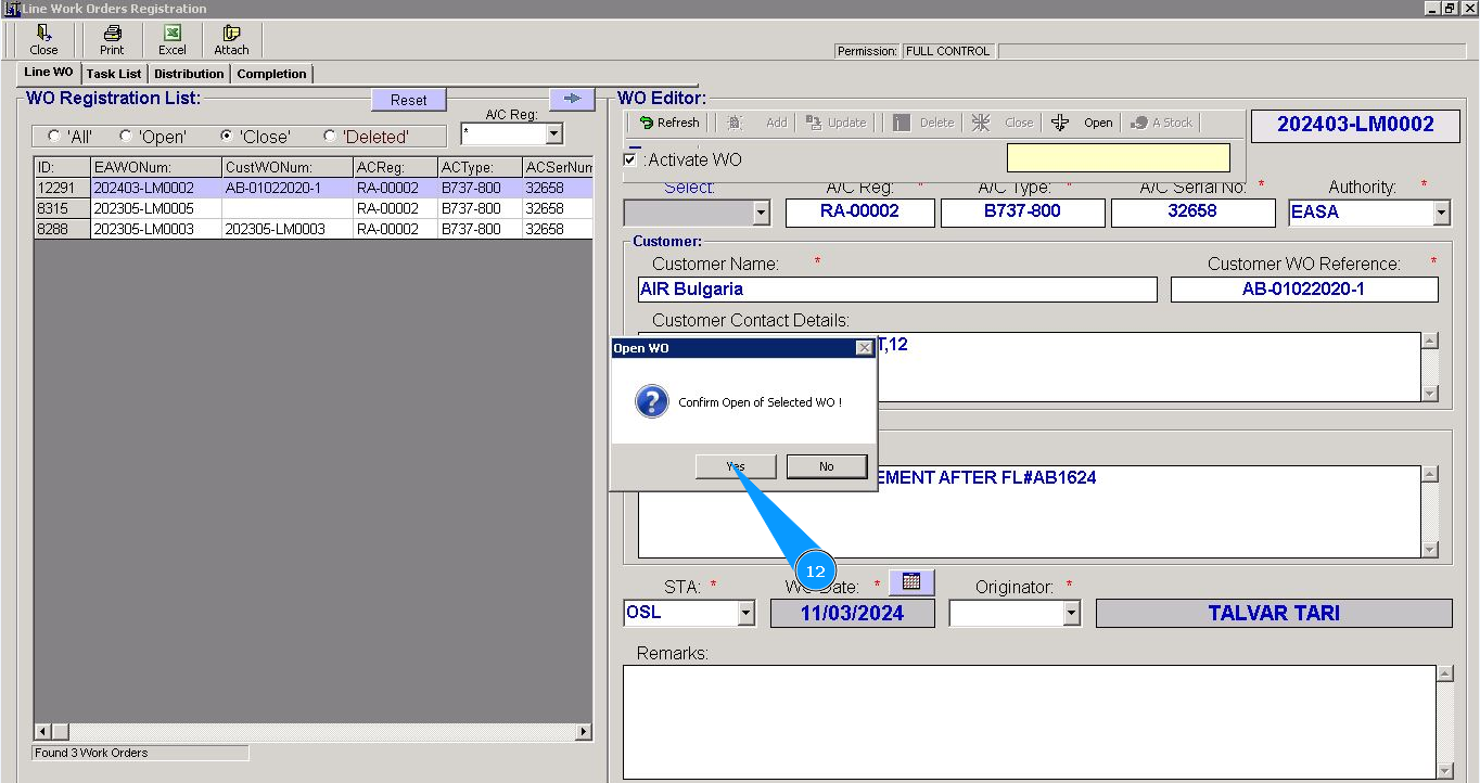9. Click on the button "Yes", to confirm the opening of Work Order.