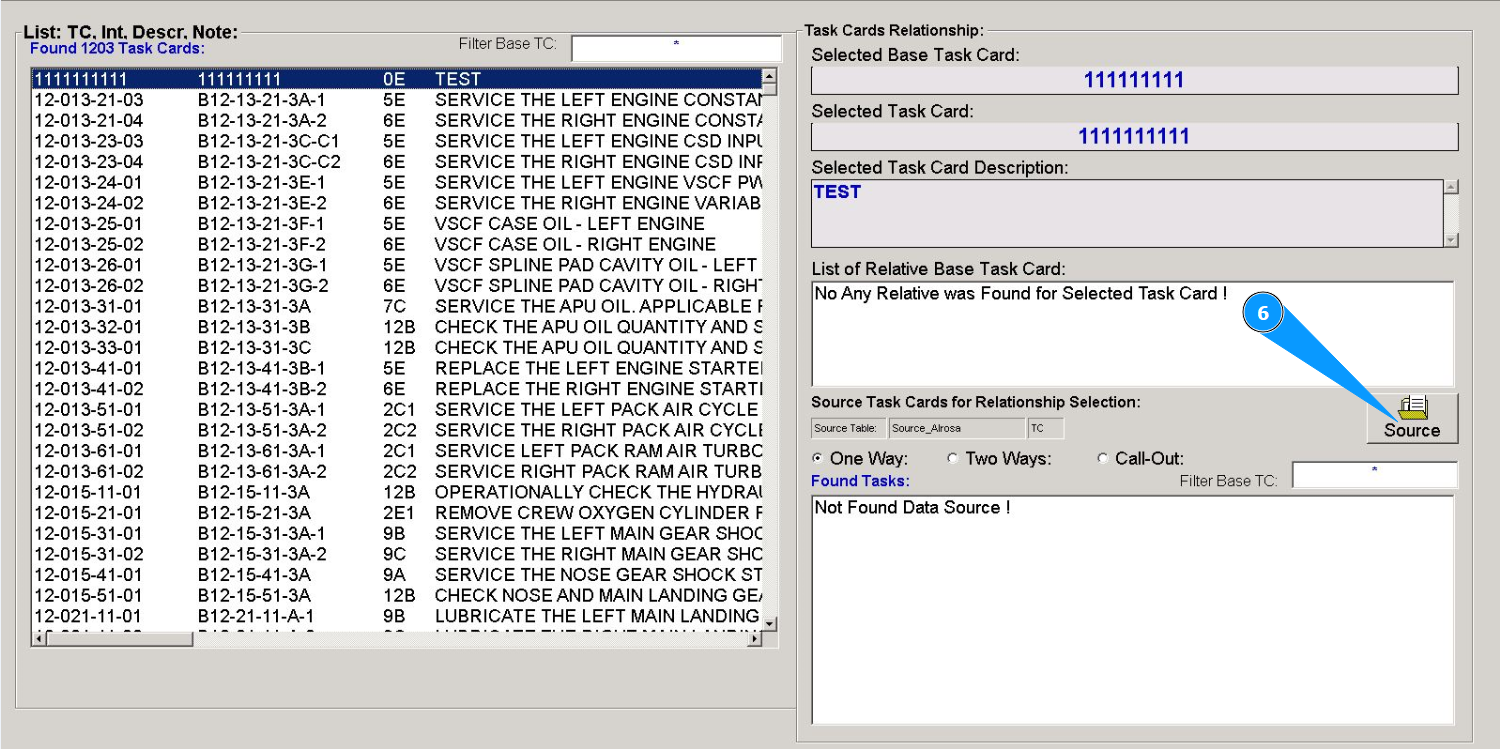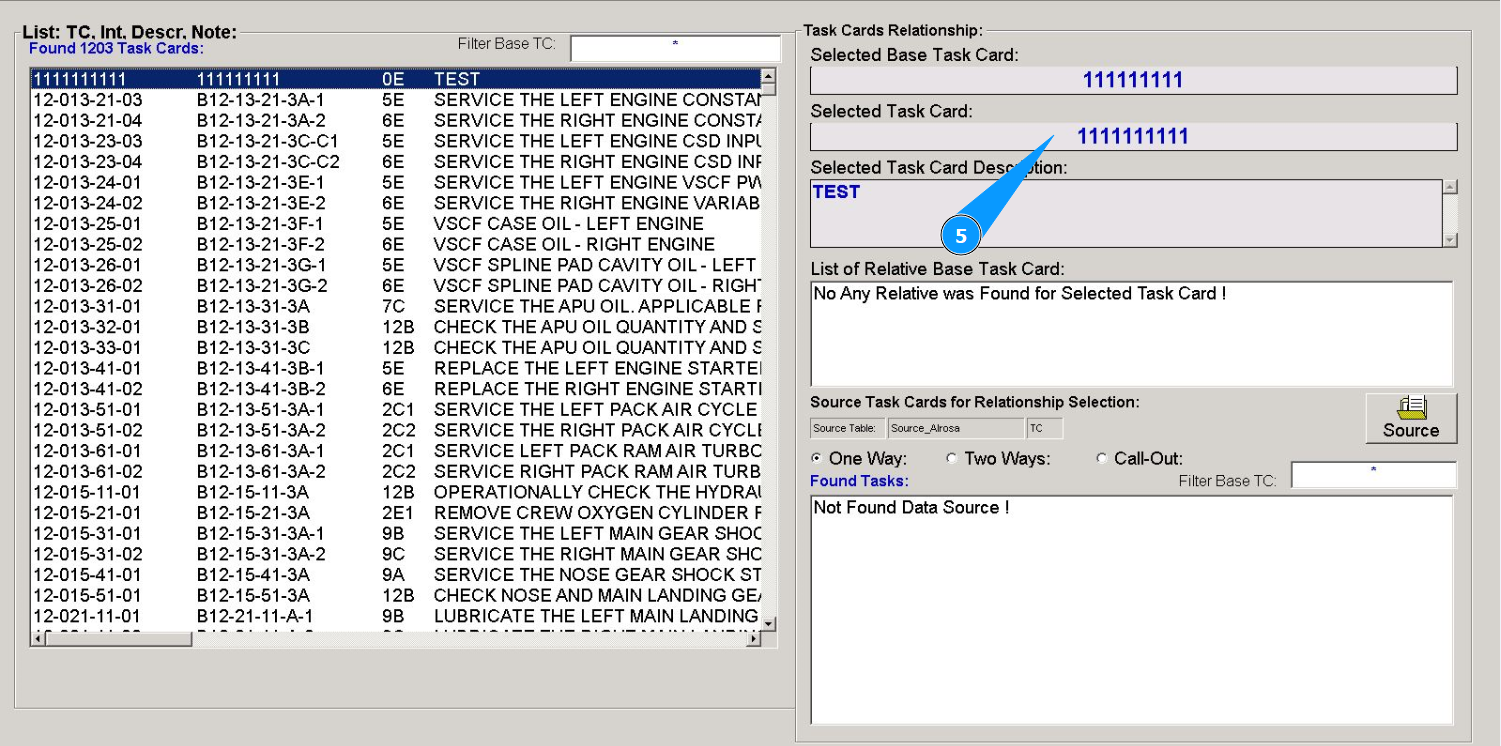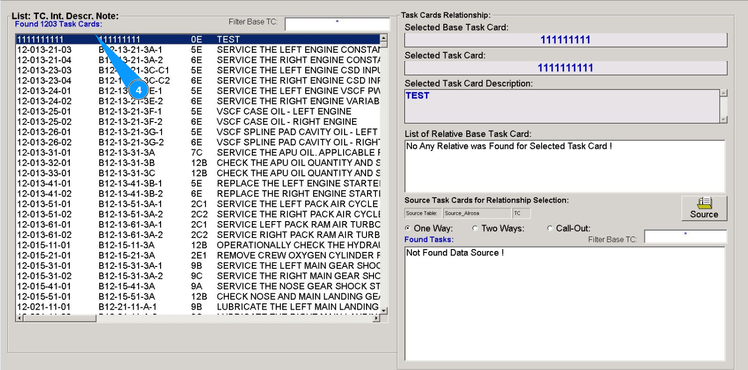 10. Select the required task to set the relationship in the widow "Source Task Cards for Relationship Selection" and click on the appropriate line. Note: If necessary, use the available filter in the field: "Filter Base TC".