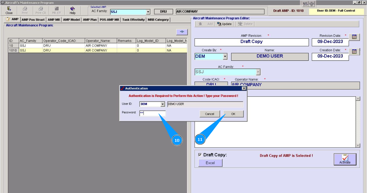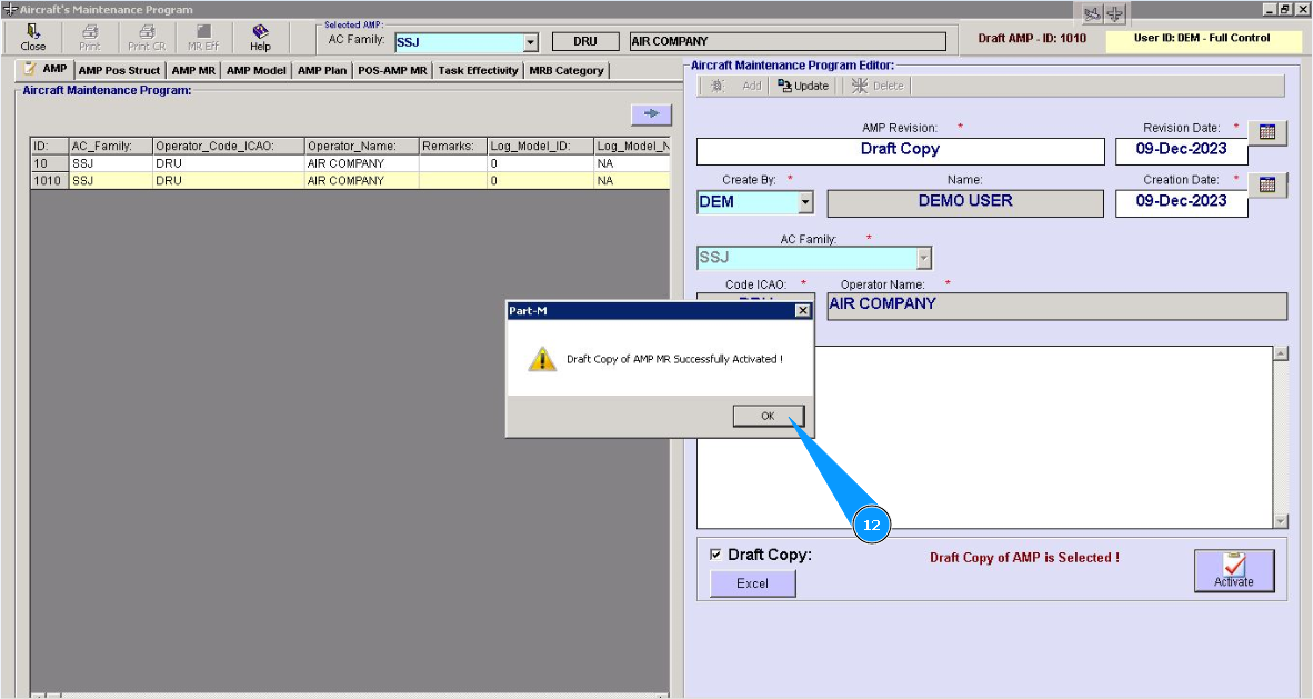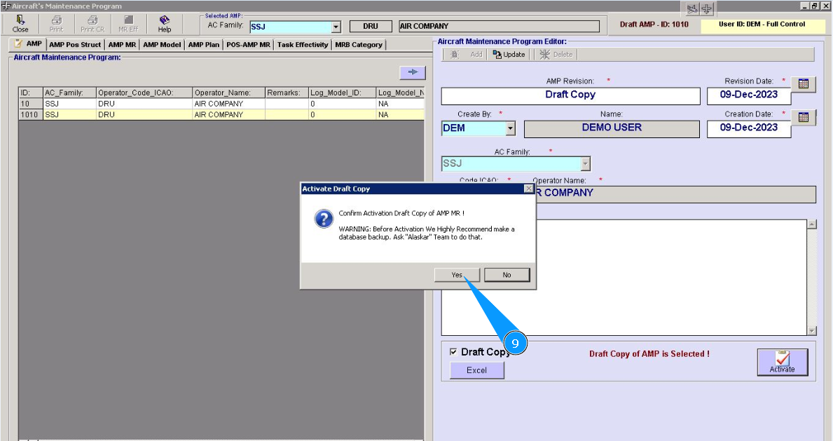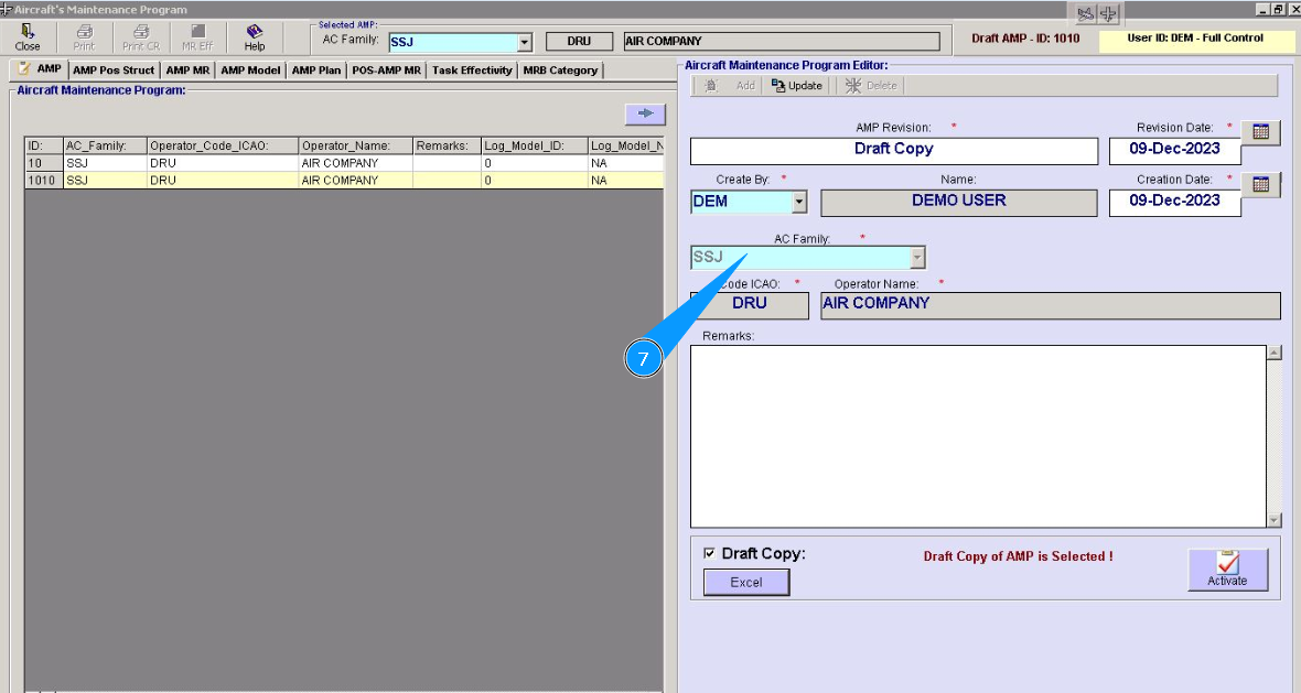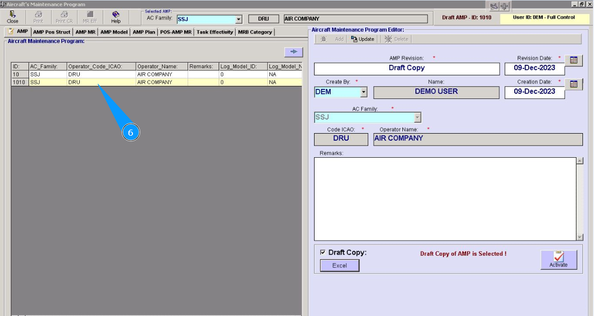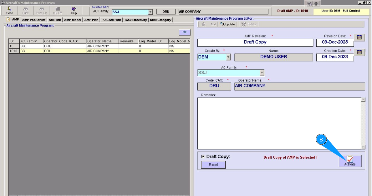 1. To activate the Aircraft Maintenance Program draft, go to the tab "AMP- Maintenance Program".