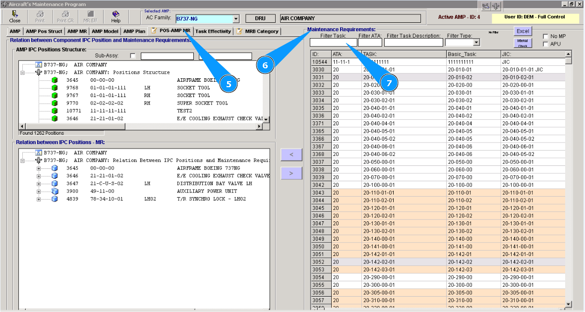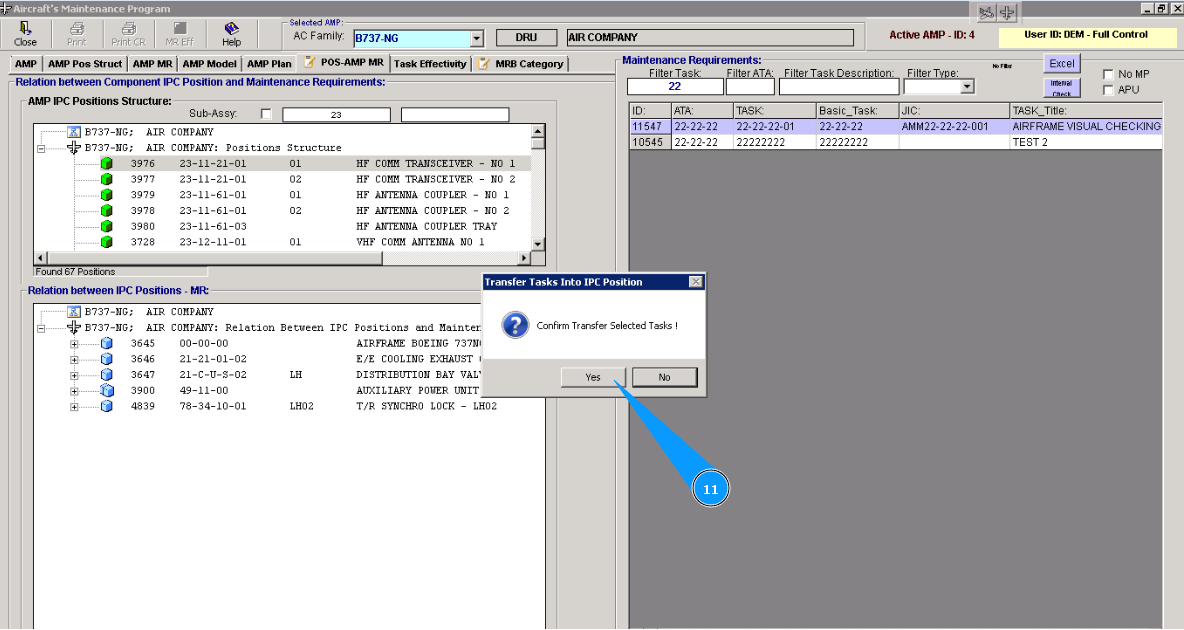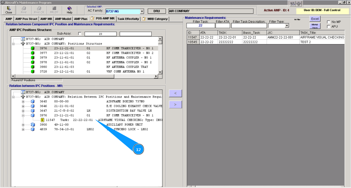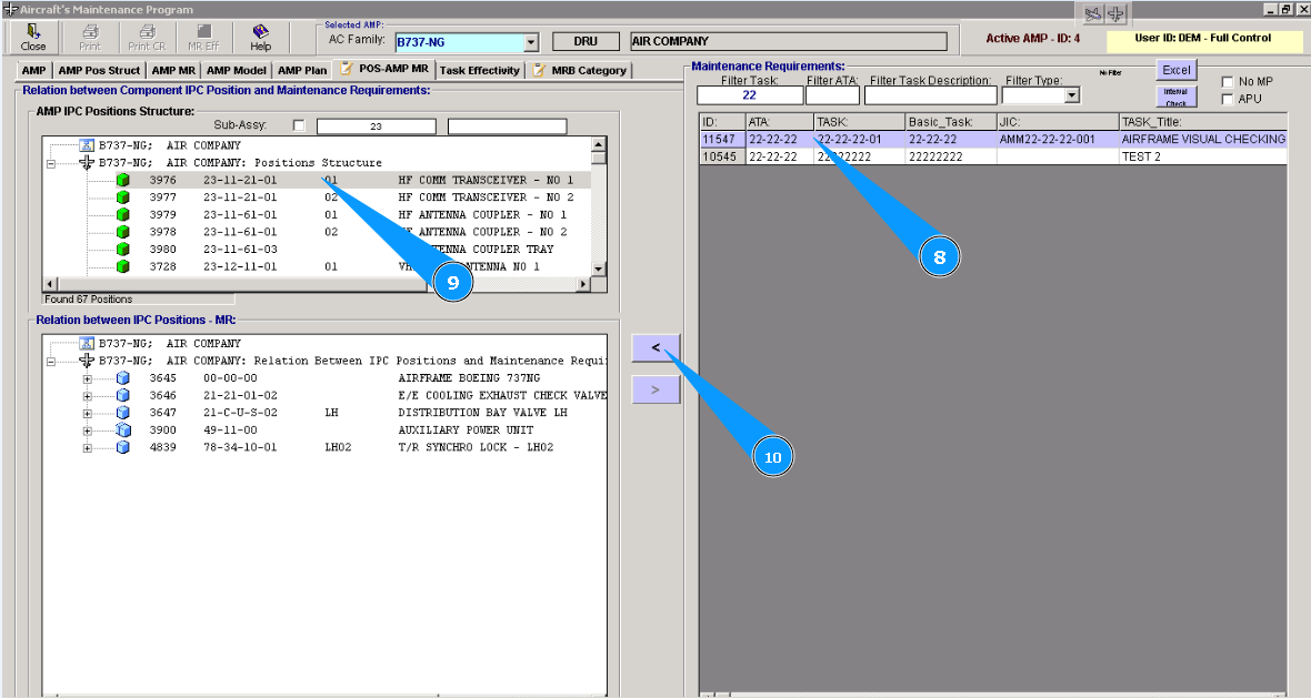 9. Select the corresponding component's position, for linking with the corresponding task in the window "Relation between Components IPC Position and Maintenance Requirements".
