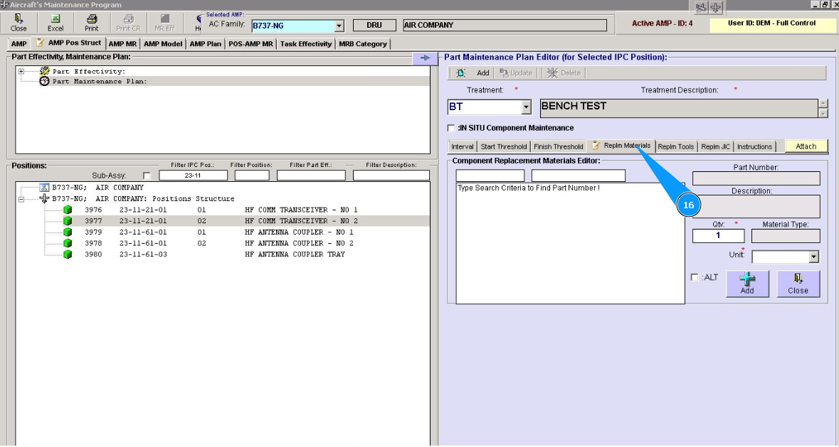 16. Enter the required materials for maintenance of this treatment in the tab "Replm.Materiaals".