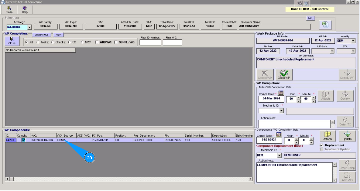 20. Select the line with WO and component, click on it in the window "WP Components" press on the knob "Delete" on your keyboard.