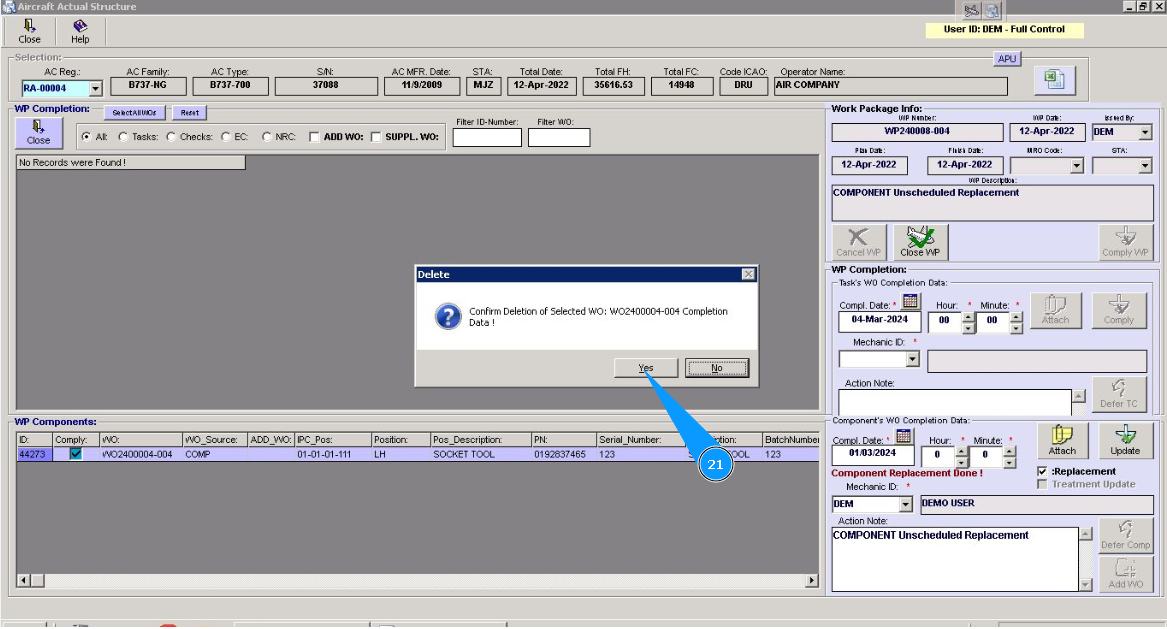 21. Click on the button "Yes", to confirm WO deletion.