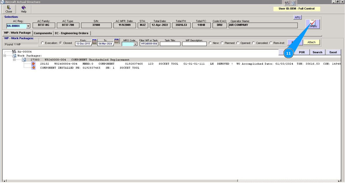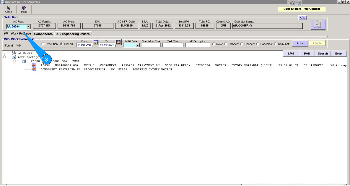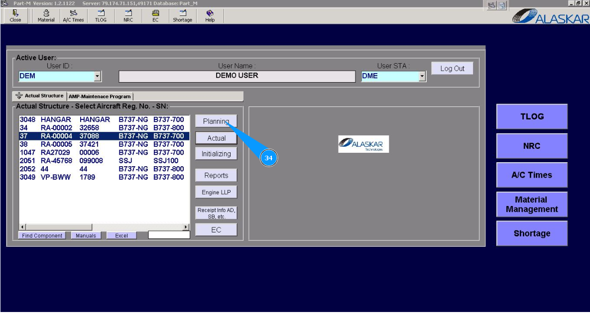 2. Select the aircraft registration number from the list in the window "Actual Structure-Select Aircraft Reg.-SN".