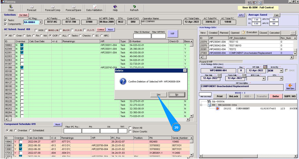 39. Click on the button "Yes", to confirm WP deletion from WP list.