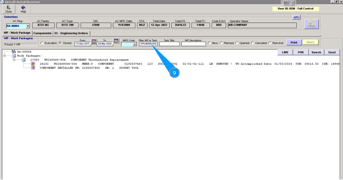 9. Enter the noted WP number in the line "Filter WP or task" and press on the knob "Enter" on your keyboard.