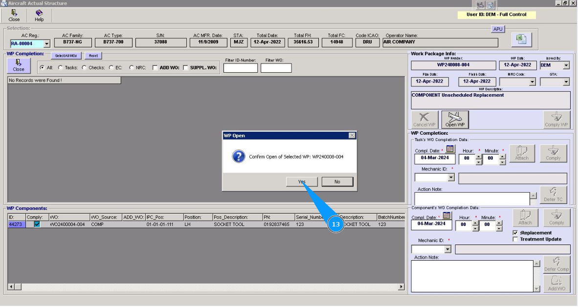 13. Click on the button "Yes", to confirm WP opening.