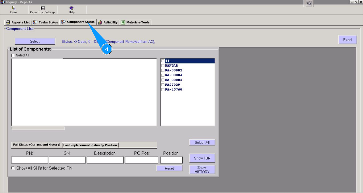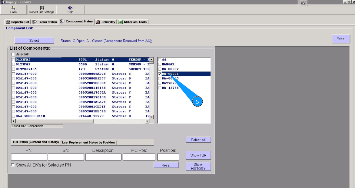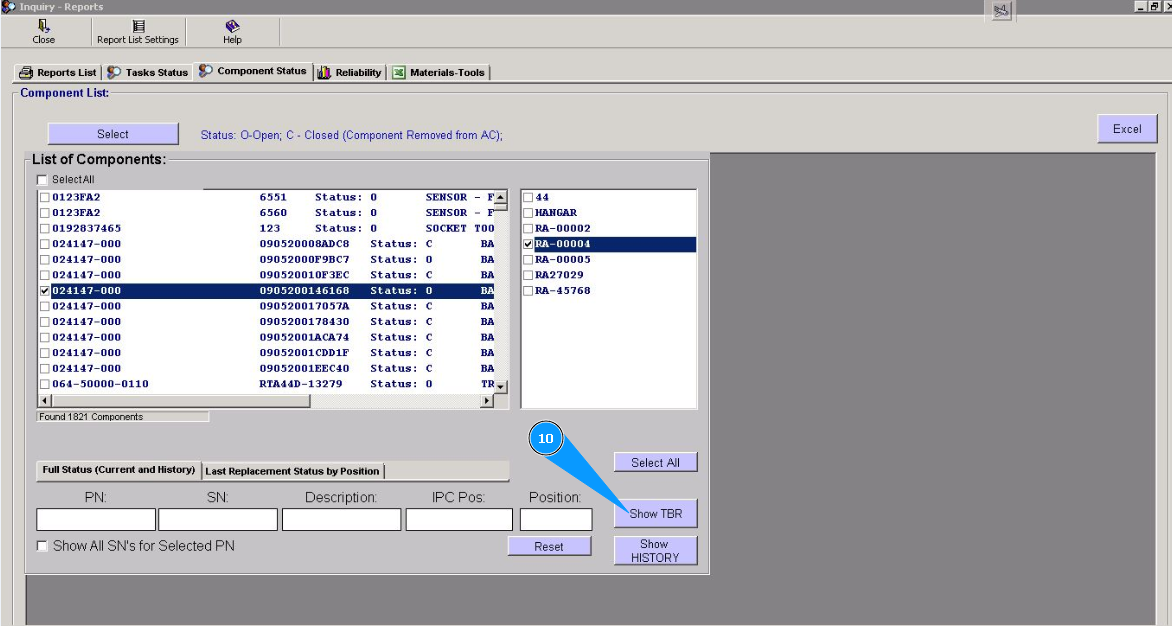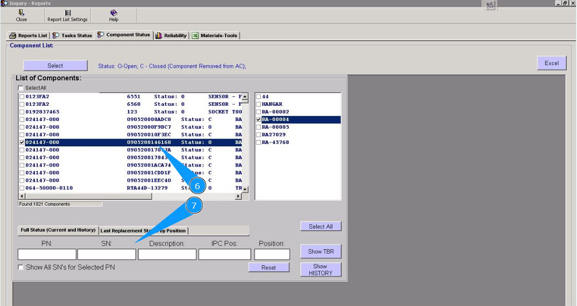 7. If necessary, enter the searching serial or part number in the fields "PN" or "SN".