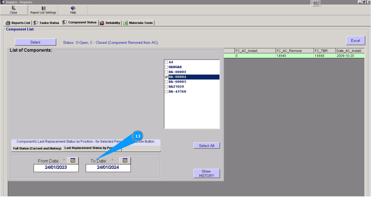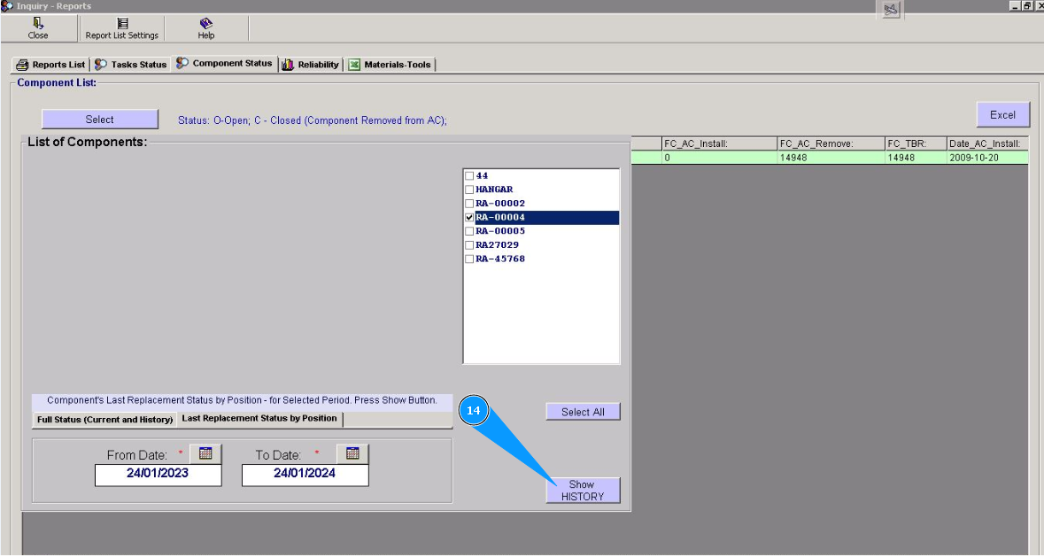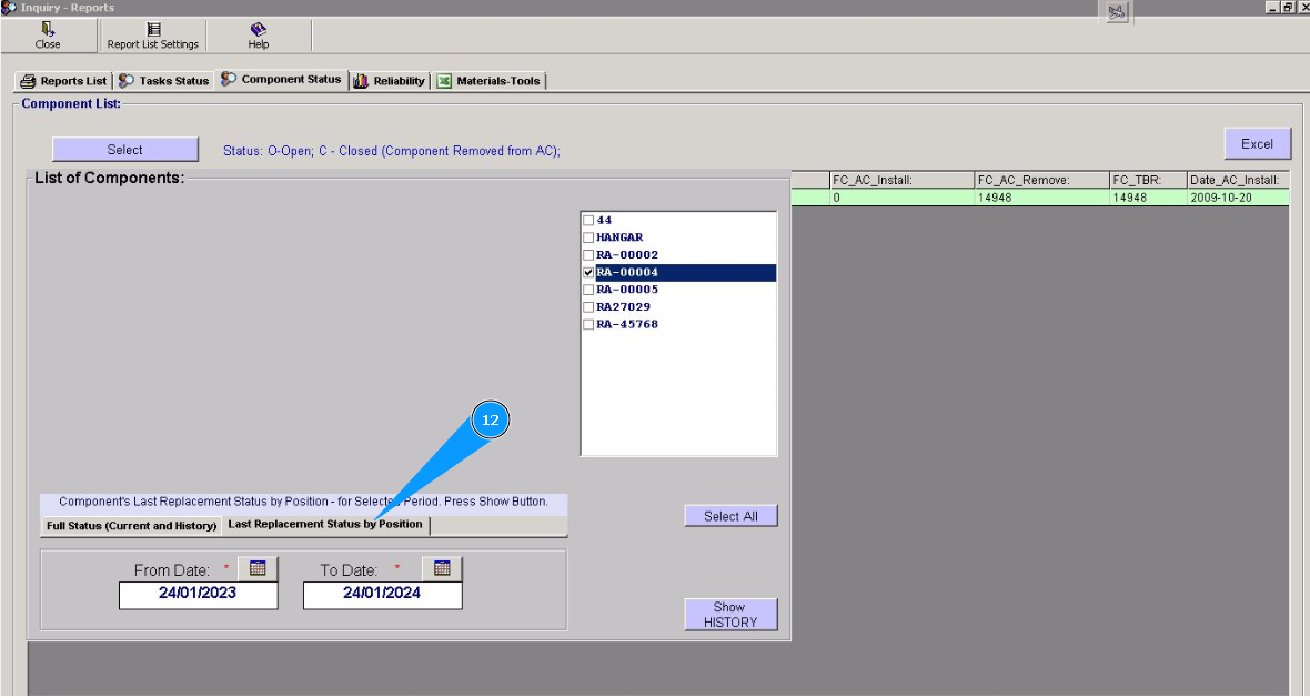 12. If necessary, to receive information about the last replacement of components for a time period, go to the tab "Last Replacement Status by Position".