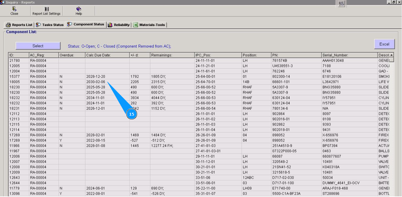 15. Information about the last replacement of components for a time period is available in the opened window "Tasks List".